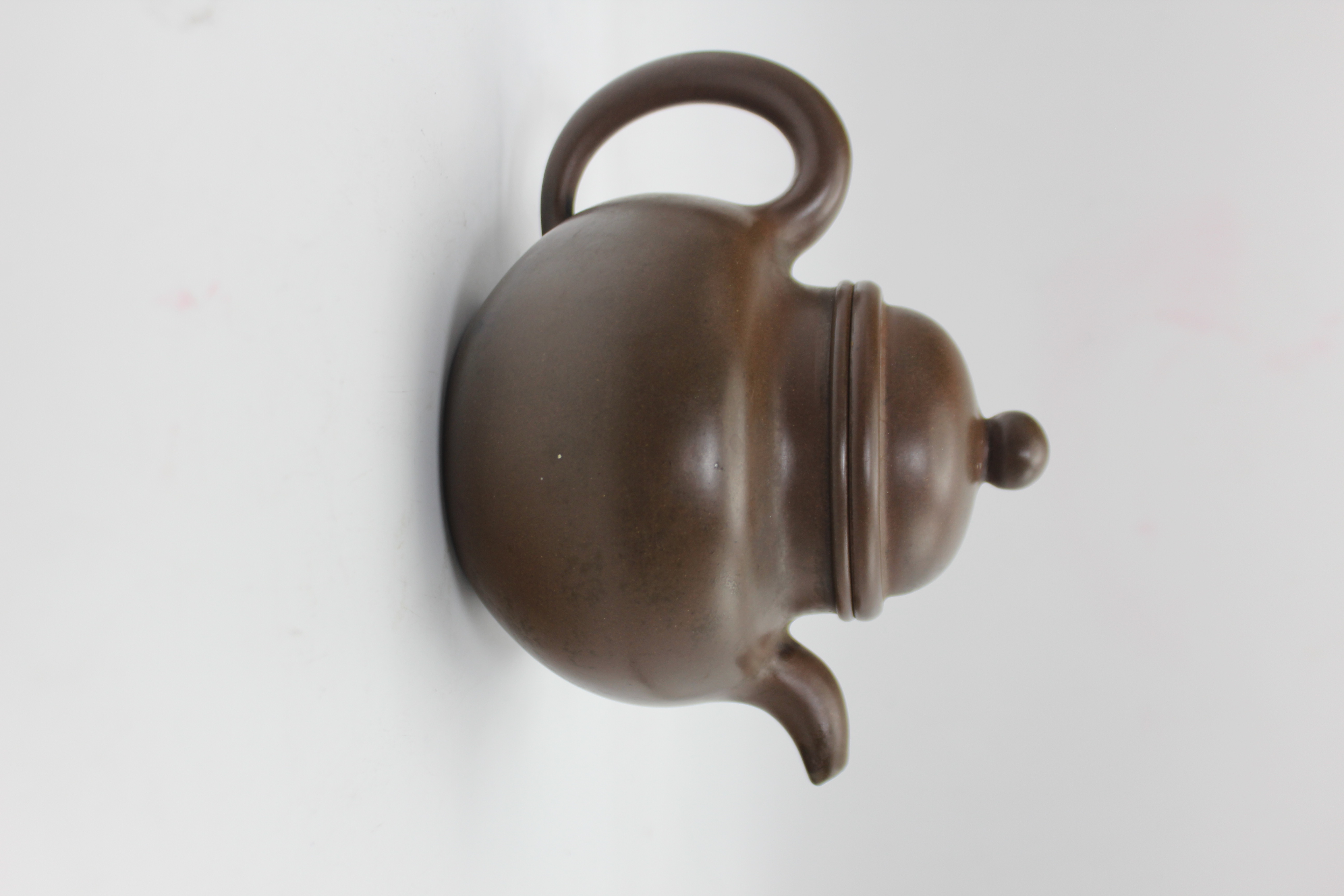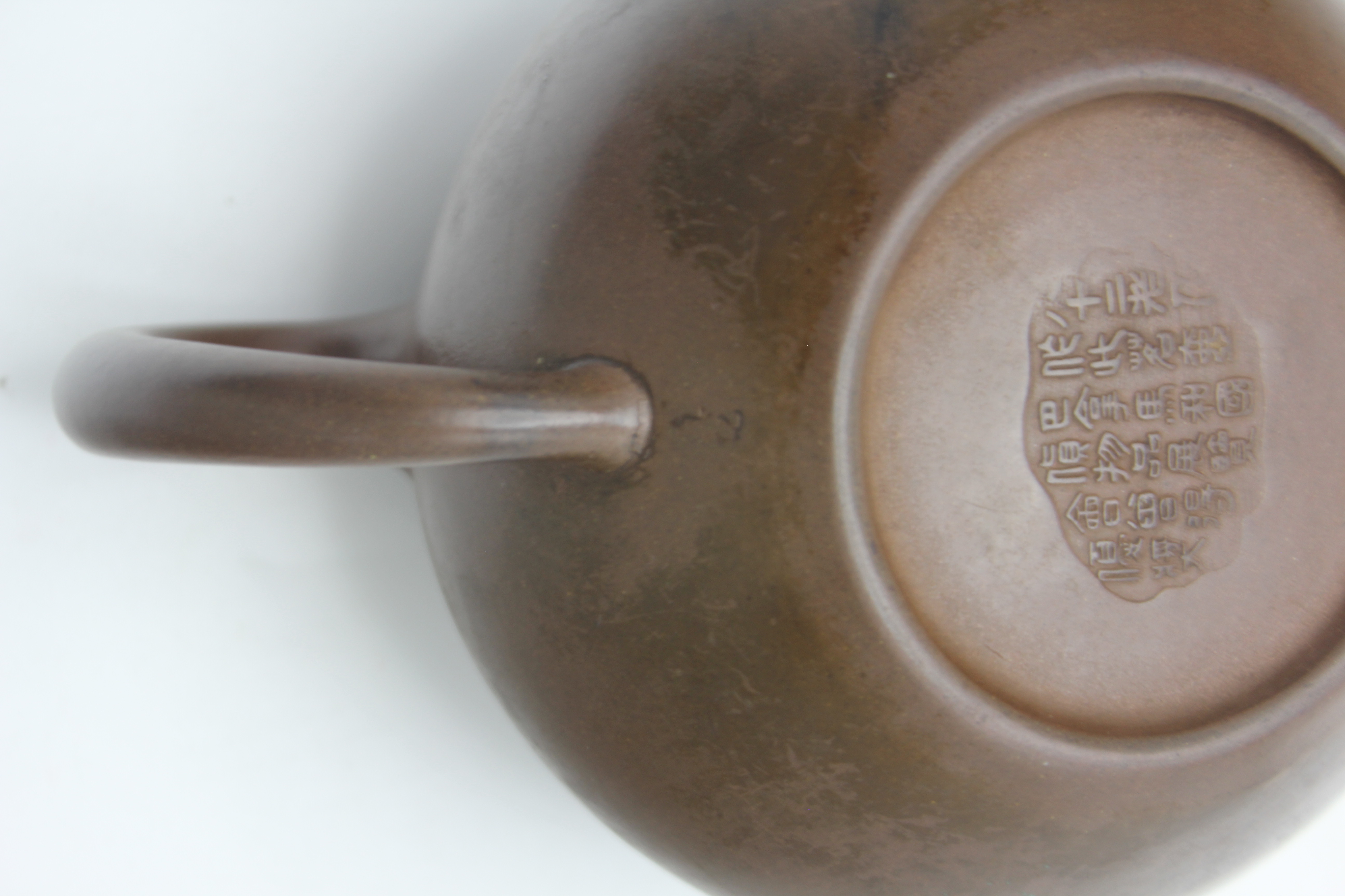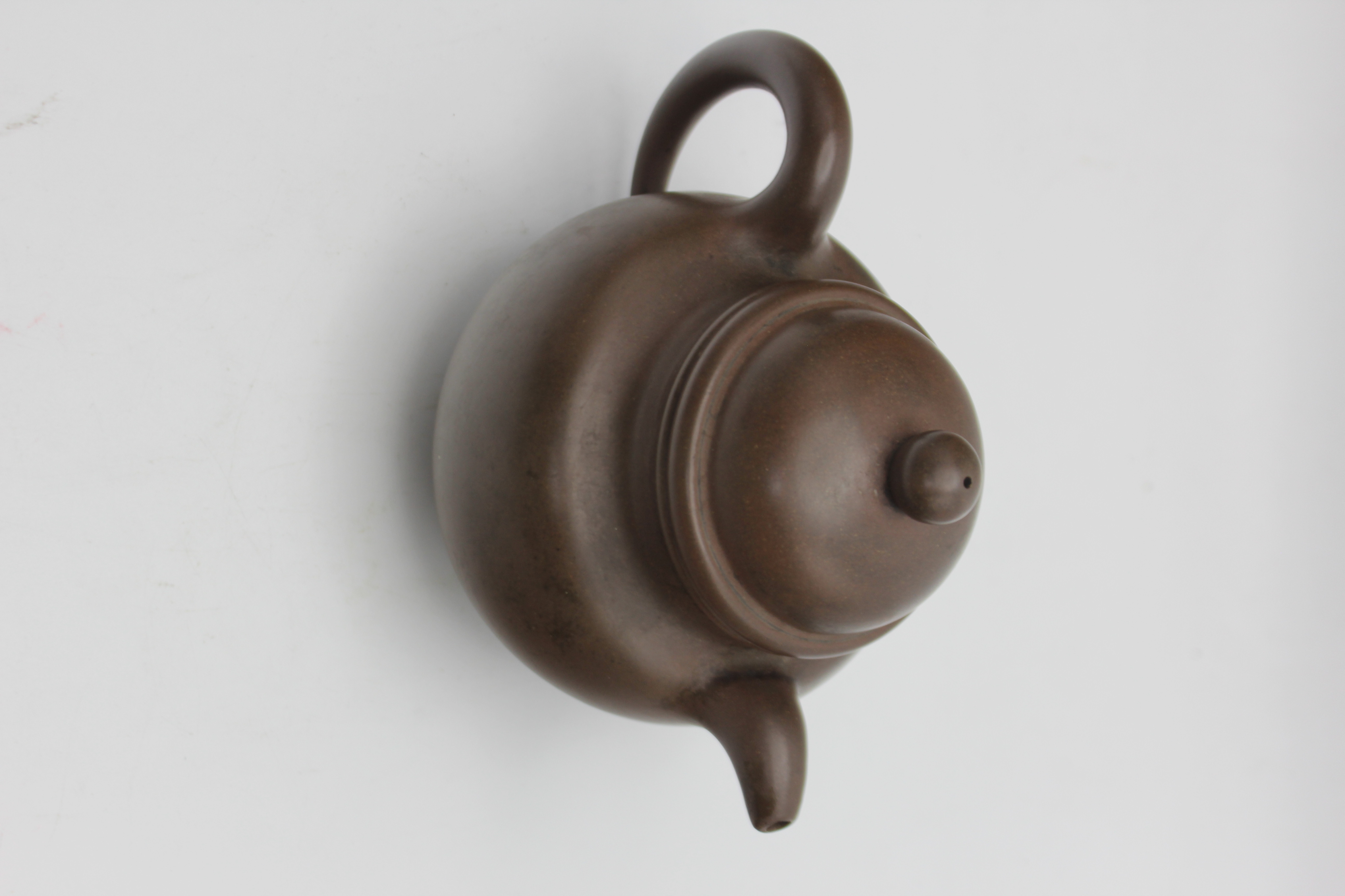 程寿珍是清末民初宜兴紫砂的代表性匠人,他出身紫砂世家,随养父邵友廷习得制壶基础,擅长光素器型,尤其掇球、仿古两款最为人称道。其制壶风格简约规整,不求繁复装饰,更重比例协调与实用性能。选泥多取自黄龙山传统矿料,经陈腐后成型,烧成后质地坚实,手感温润,体现了传统紫砂“泥料为本”的特点。从留存实物看,壶型延续了其一贯的简洁风格,线条流畅,接口处理精细。壶底钤印“八十二老人作此茗壶”,直观反映了制作时的年龄,也侧面说明他晚年仍坚持制壶,工艺手法未因年事已高而懈怠。1915年,程寿珍的作品参与巴拿马万国博览会巡展,其中掇球壶获金奖,这是中国紫砂早期在国际展会中的重要亮相,一定程度上提升了紫砂工艺的国际认知度。从市场角度看,程寿珍作品因工艺规范、存世量有限,且有明确历史背景,成为紫砂收藏领域的常见标的。近年拍卖市场中,其精品成交价多在数百万元级别,反映出市场对其工艺与历史价值的认可。