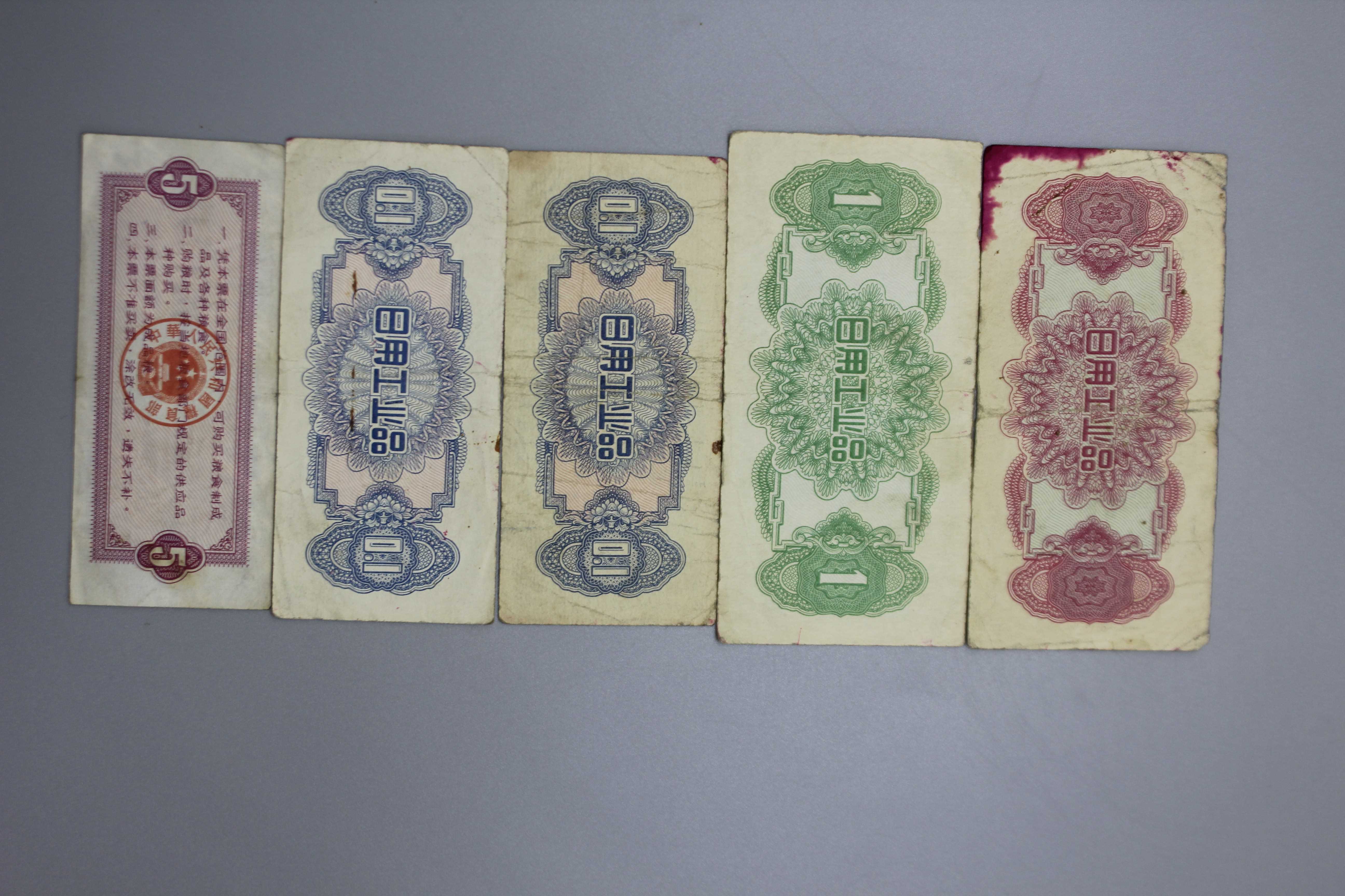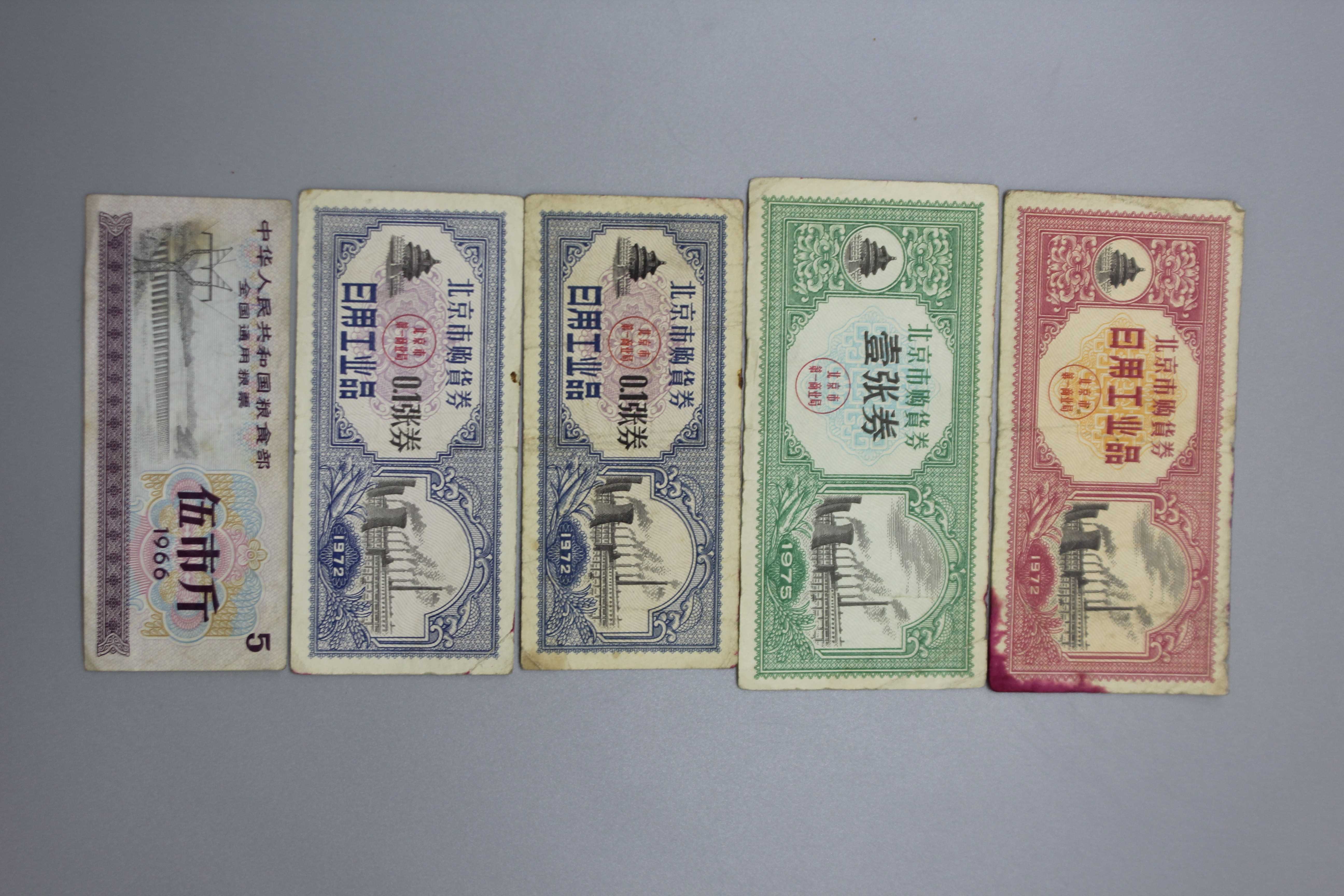 【工业票 购物票 粮票一组五张】这一组票证是中国计划经济时期(20世纪50-80年代)的重要实物见证,反映了物资短缺时代的生活面貌。工业票用于购买工业品,购物票对应日常商品,粮票则是粮食配给核心凭证。它们不仅是特殊历史阶段的记忆载体,更展现了国家经济体制转型的轨迹。如今存世量逐渐减少,其史料价值与收藏价值日益凸显,是研究中国近现代社会史、经济史的珍贵文物,备受藏家青睐。