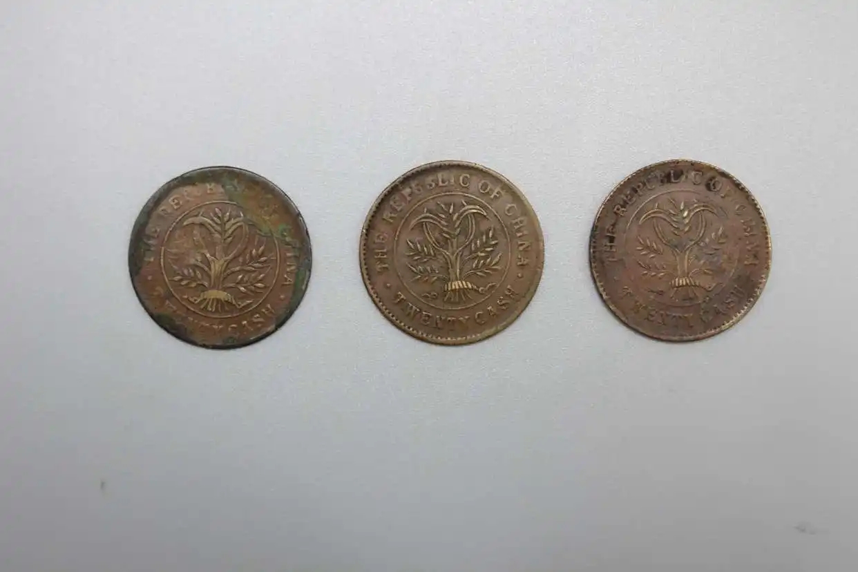 这几枚湖南省造双旗币二十文,简直是民国历史与收藏魅力碰撞出的 “宝藏铜币”,从历史意义到艺术价值,每一处都闪耀着让人挪不开眼的光芒!它诞生于民国初年(约 1912 - 1927 年),正赶上中国从封建帝制奔向共和的关键转折期。特别关注中间这枚,它不是普通的民国铜币,而是湖南省造双旗币二十文 “背逆 15°” 错版币。指尖拂过币面的那一刻,仿佛能触到百年前造币厂的机器震动,能看见武昌起义后新政权的理想微光,能读懂 “错” 出来的意外,如何成为收藏界 “可遇不可求的神级图腾”。这不是一枚简单的 “钱”,而是裹着时光包浆的 “历史活化石”,是藏着艺术巧思的 “孤品创作”,更是能与百年前的时代对话的 “精神信物”。今天,我们就循着这枚错版币的纹路,拆解它背后的时代密码、艺术价值与深层意义。