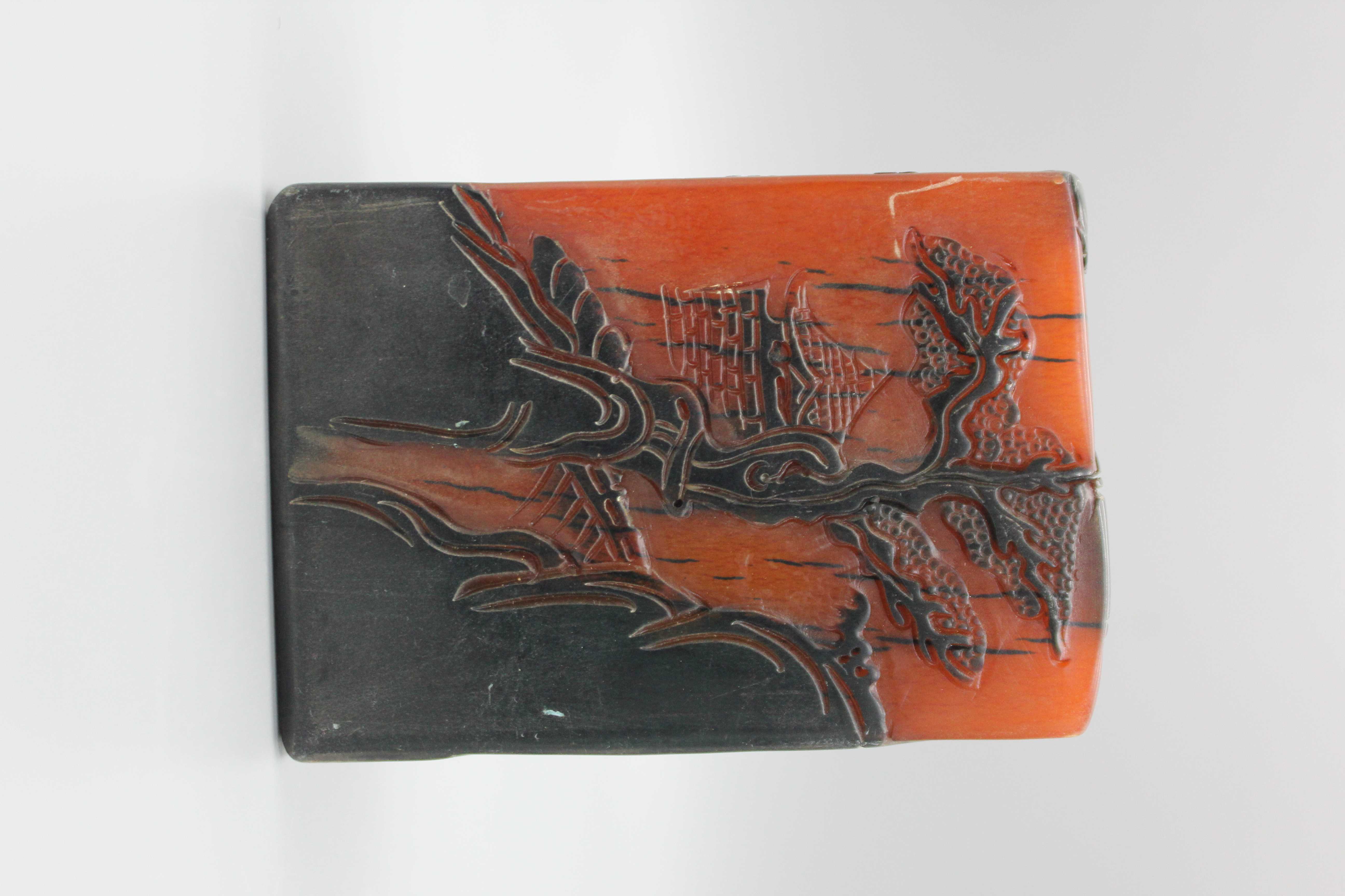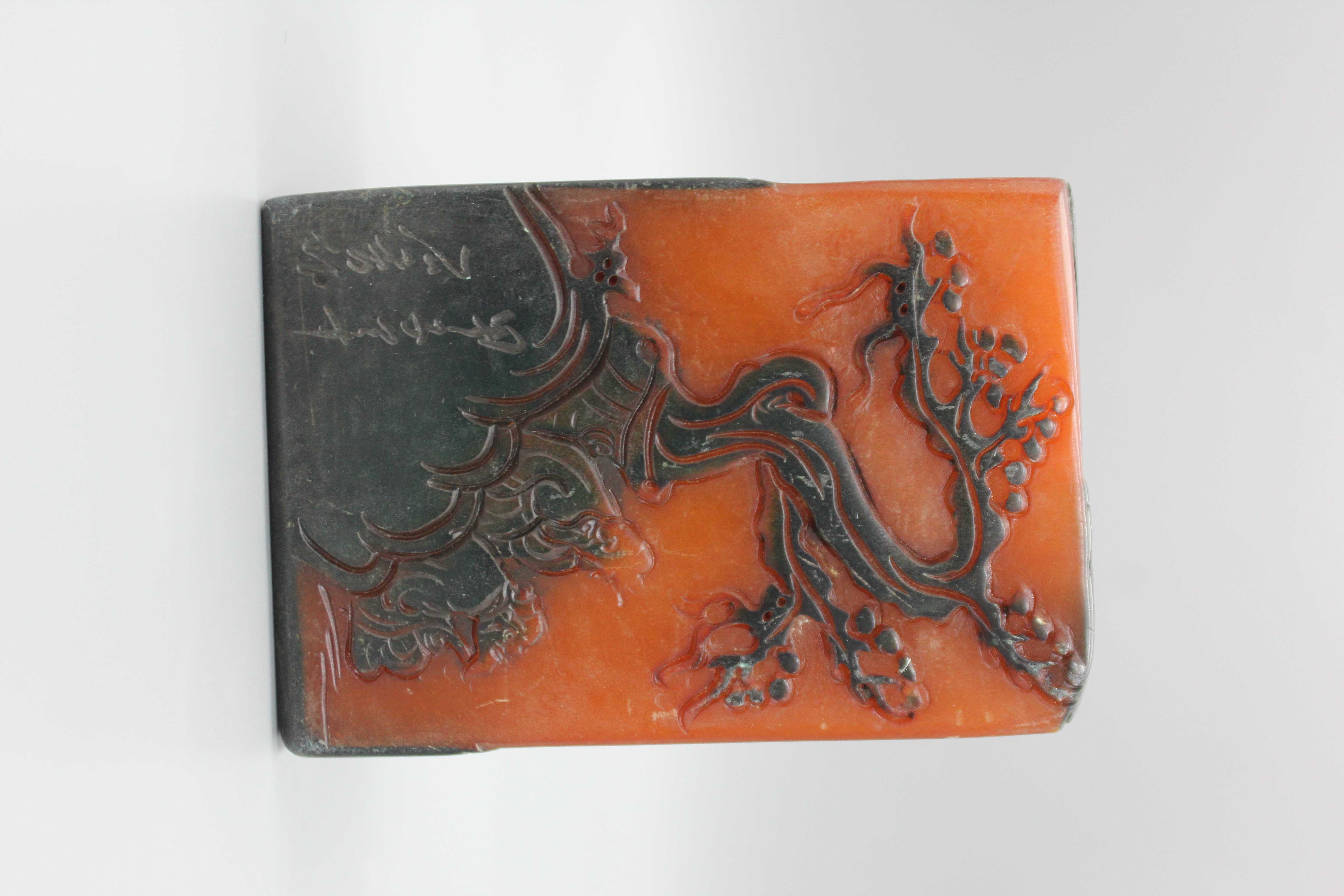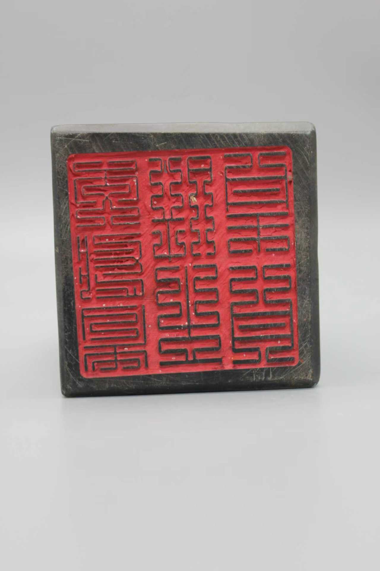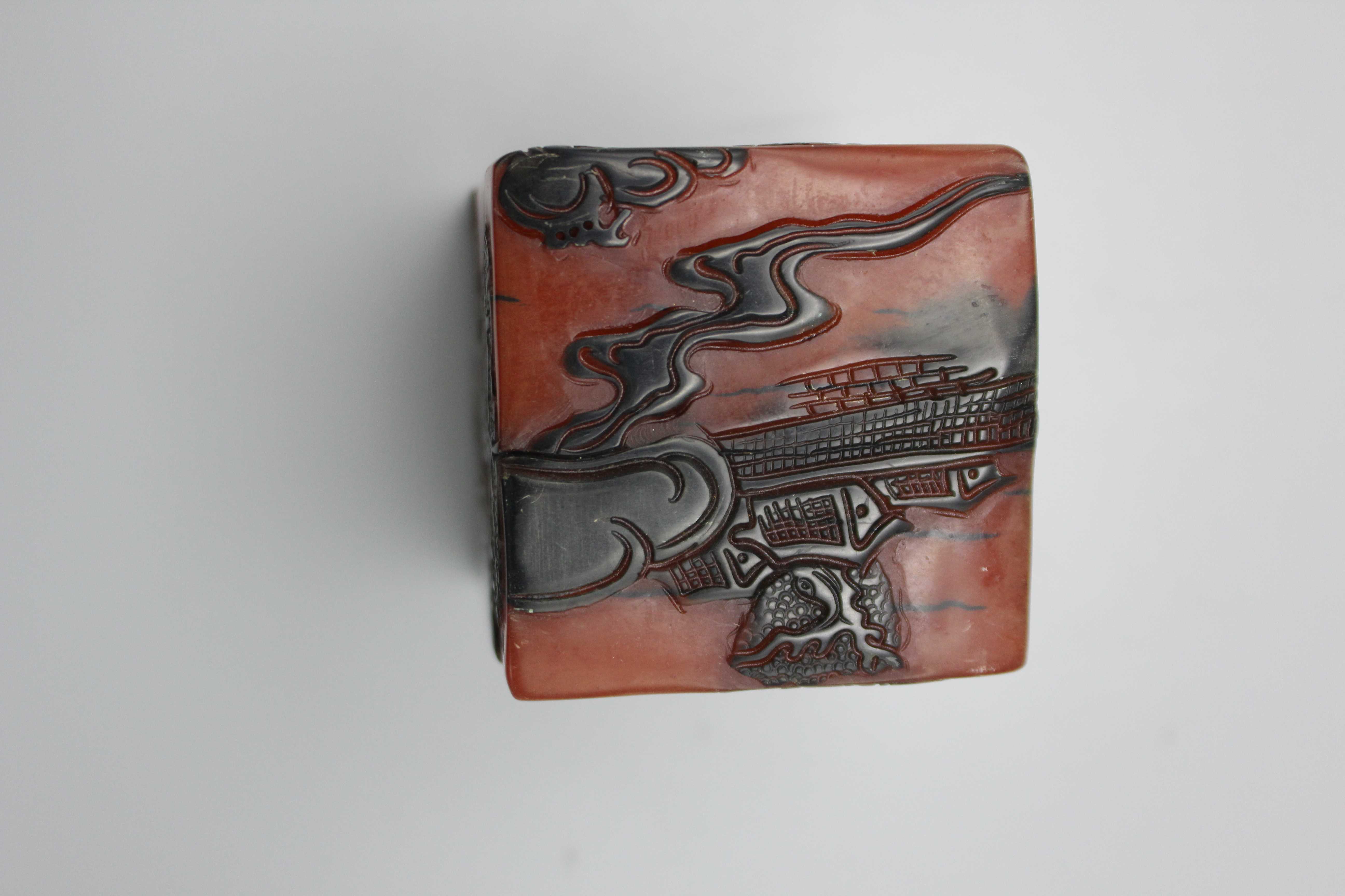 田黄石印章,红黑双色交辉。正面巧琢松梅高士,枝干虬曲,人物传神,刻款“甲子年石秀作”,古韵悠悠;另一面松亭隐于山畔,刀工细腻。印面篆文布局严谨,线条婉转,集雕刻、篆刻艺术于一身,是文房雅玩中兼具历史韵味与工艺之美的珍品,方寸之间,尽显传统艺术的精妙绝伦