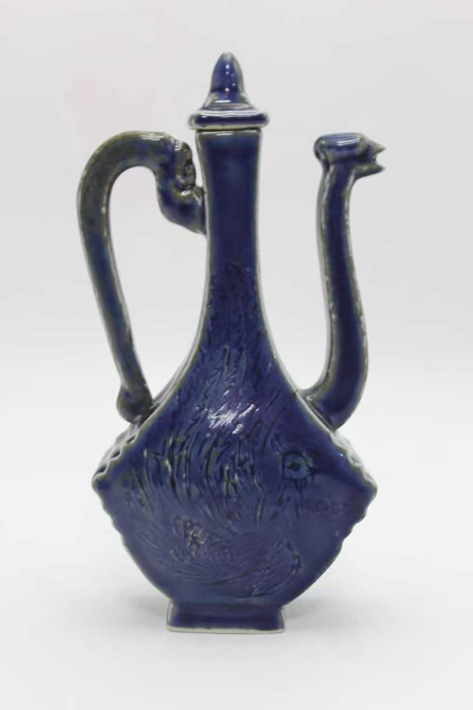 | 名称:元代霁蓝釉暗刻龙凤纹凤首龙柄执壶 |