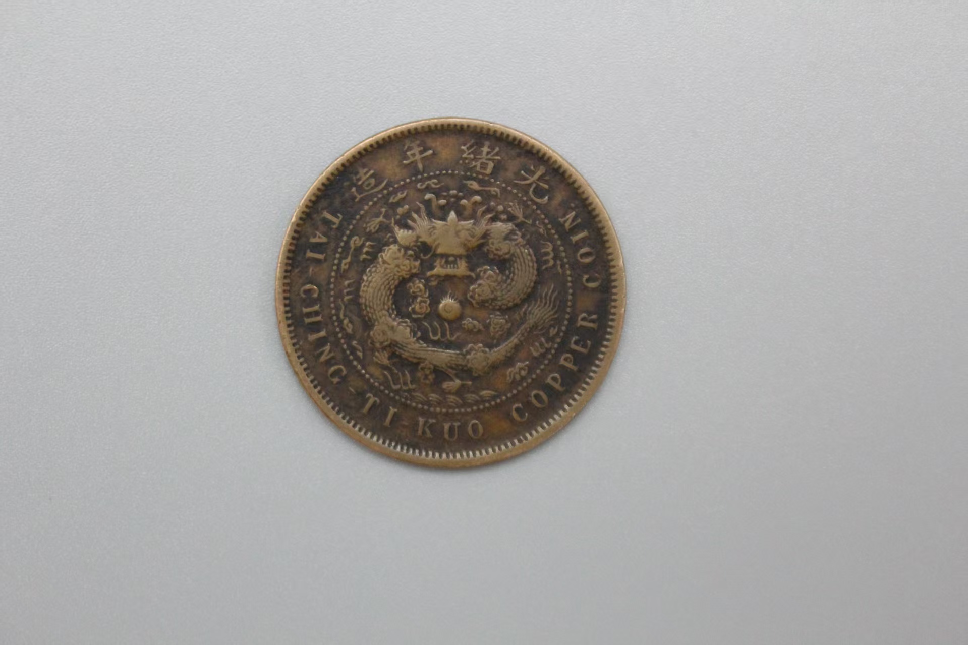 这枚大清铜币粤字版,是光绪年间广东铸币工艺的珍贵遗存。币面“大清铜币”四字苍劲有力,中心“粤”字醒目,彰显岭南地域文化印记;“户部”铸款与“当制钱十文”标识,还原清末货币制度风貌。背面蟠龙纹饰细节精湛,龙鳞、云纹清晰可辨,尽显晚清造币的工艺水准。其包浆醇厚,是时光淬炼的历史痕迹,更是收藏价值的直观体现。