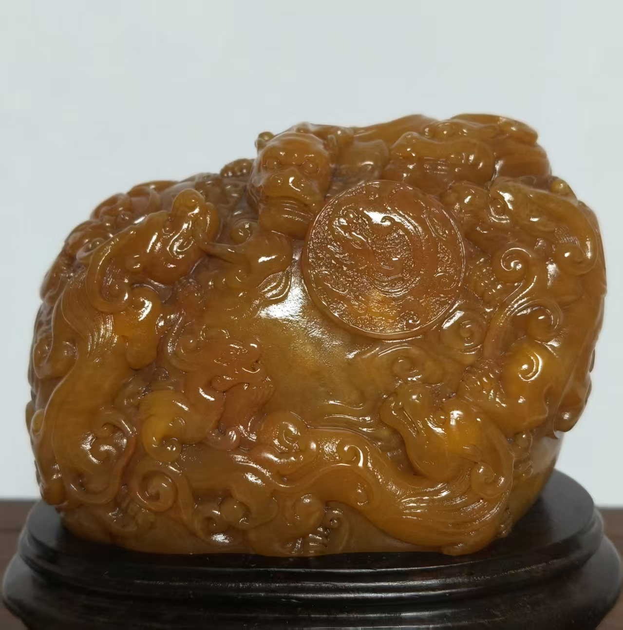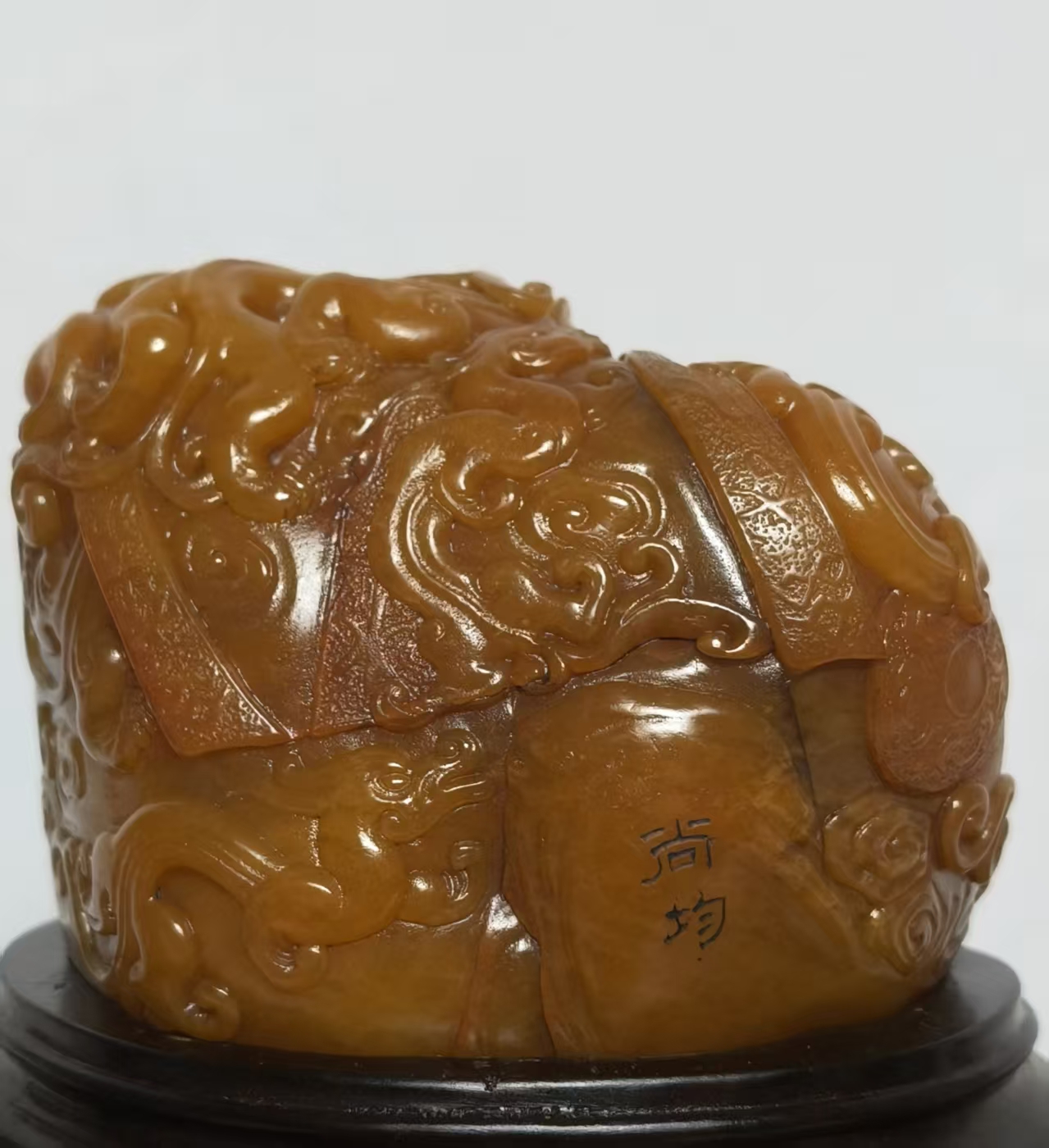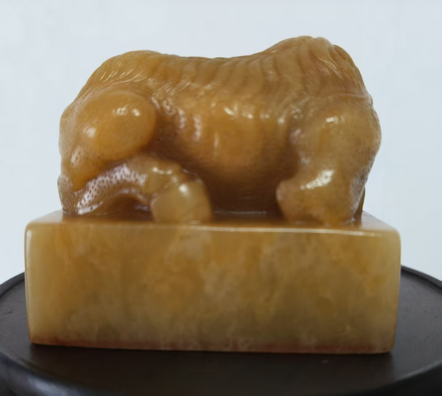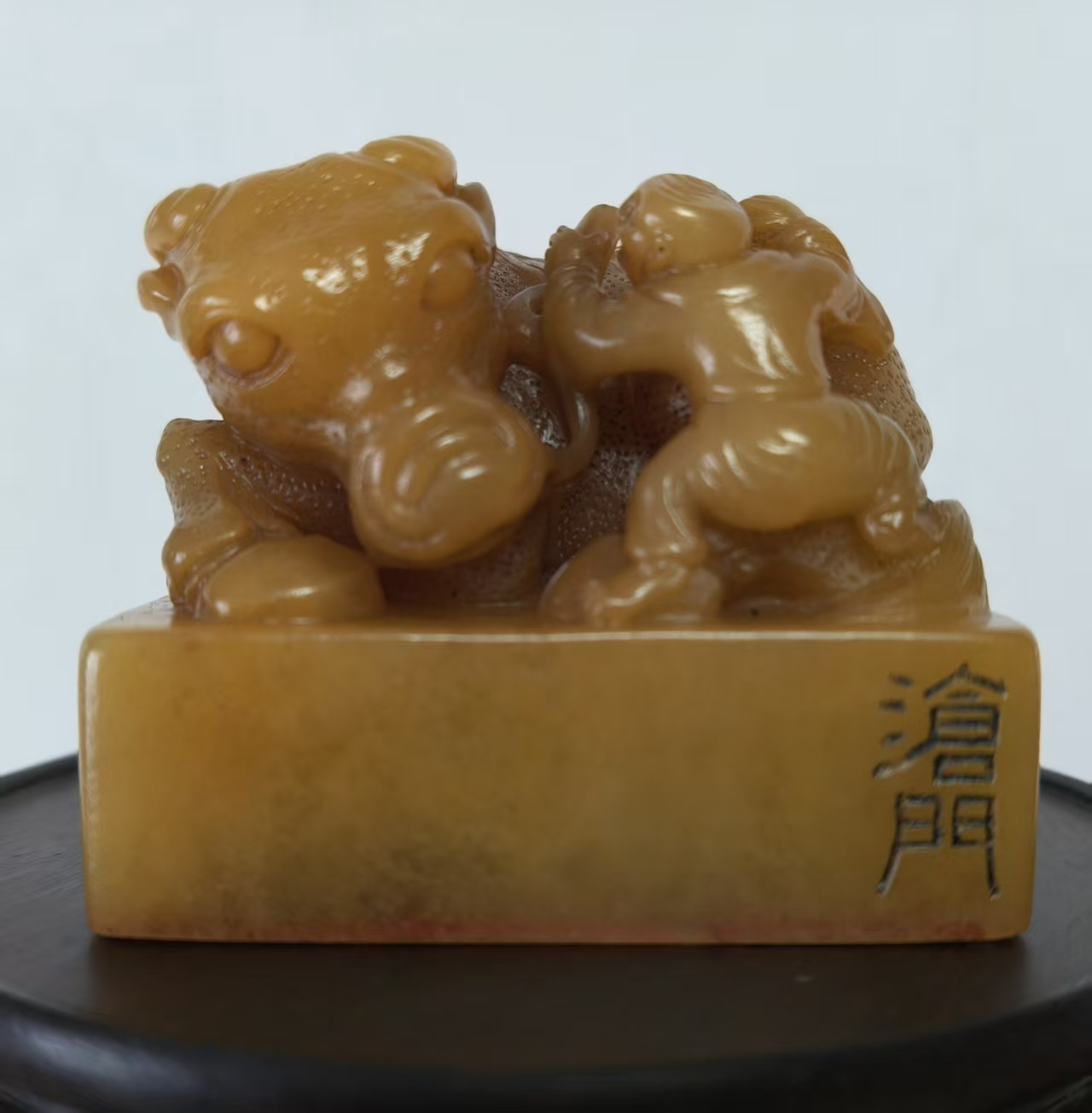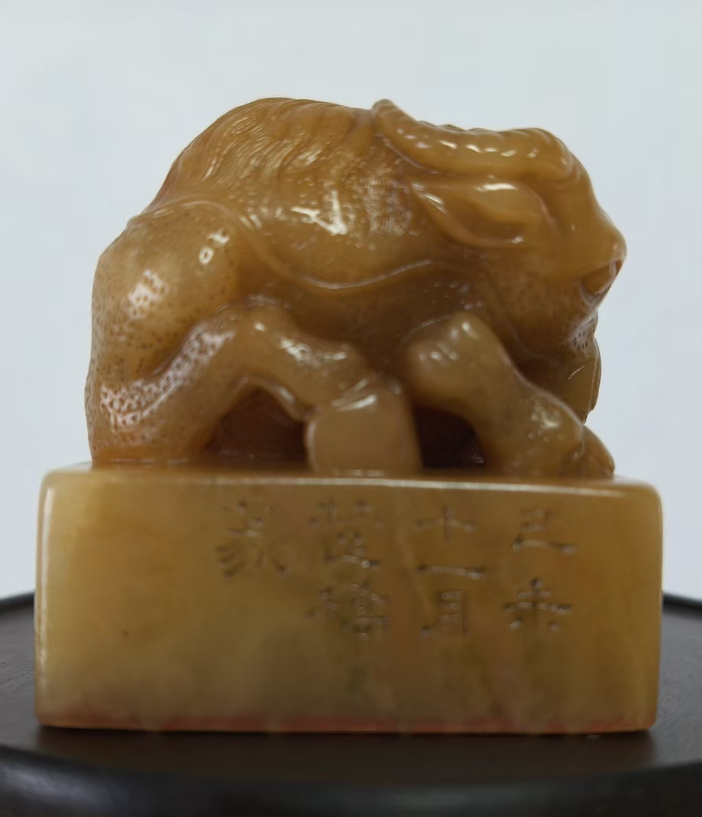 从材质、工艺与风格判断,应为乾隆时期宫廷造办处监制或皇家御藏之物。乾隆帝对田黄尤为钟爱,曾下旨“一两田黄一两金”,并将田黄定为“御用印章石”,本品的工艺水准与审美取向,正与乾隆朝宫廷艺术品“精致典雅、雍容大气”的风格高度契合。