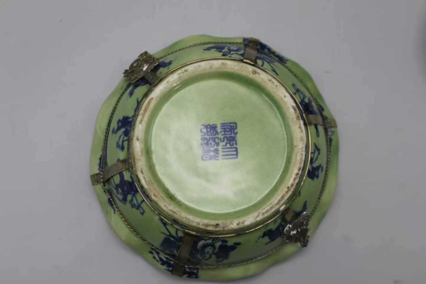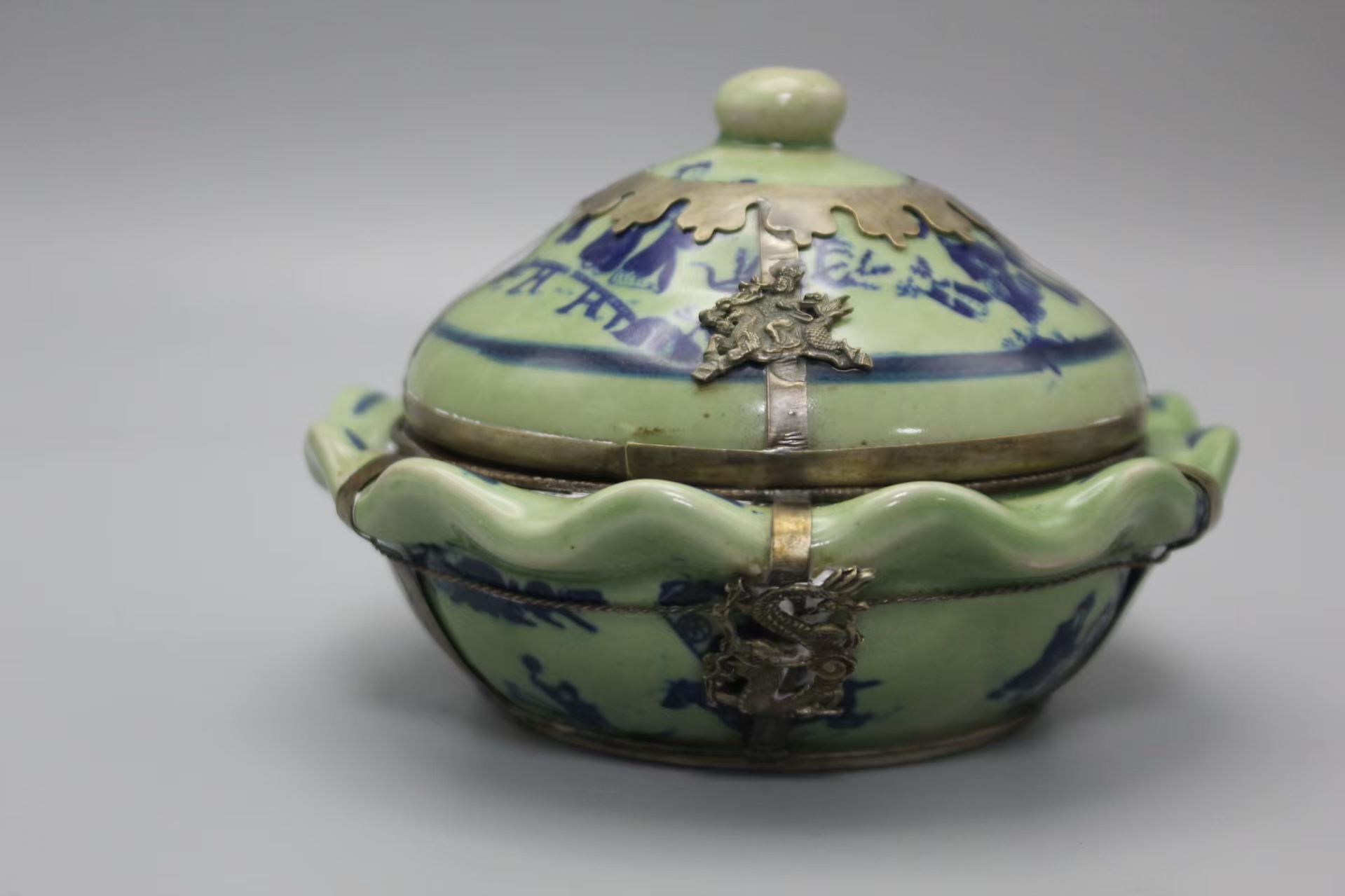 豆青釉色温润如翠玉,荷叶形盖沿与罐口曲线灵动,宛如夏荷翻卷,将自然意趣凝于瓷上。青花绘就的人物纹饰细腻雅致,再现文人闲逸生活,与豆青釉形成冷暖交织的视觉韵律。更添金属饰件点缀,铜质扣饰与瓷釉碰撞,既加固器物,又增工艺层次,是瓷铜交融的巧思之作。底足“乾隆年制”官款规整大气,彰显宫廷出身的尊贵。