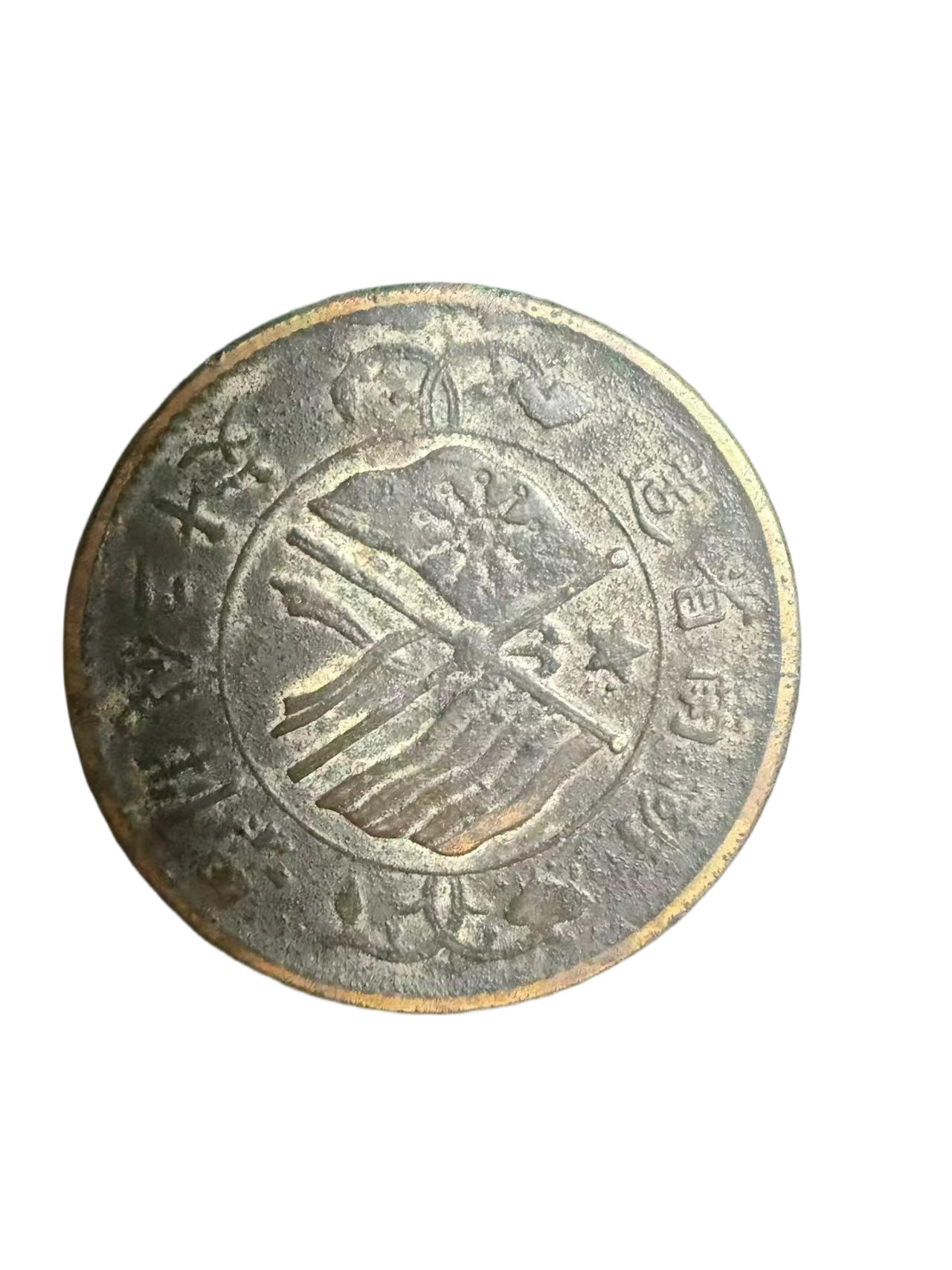正面中央为两面交叉的国旗图案,左为铁血十八星旗,象征辛亥革命中南方各省的联合;右为五色旗,代表汉、满、蒙、回、藏五族共和,旗帜纹路与飘动感刻画细腻,凸显时代精神。旗帜上方铸有“湖南省造”四字,下方则标注面值“当制钱二十文”,字体为端庄的楷书,笔锋有力,字口深峻,体现了民国初期湖南造币厂的精湛工艺。