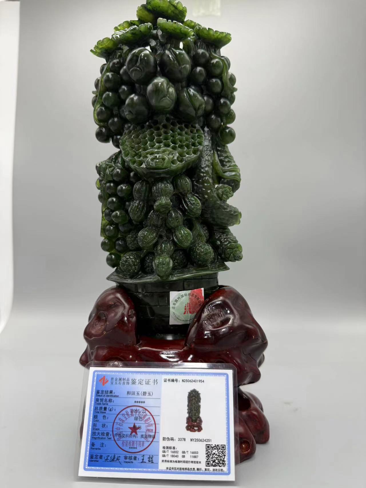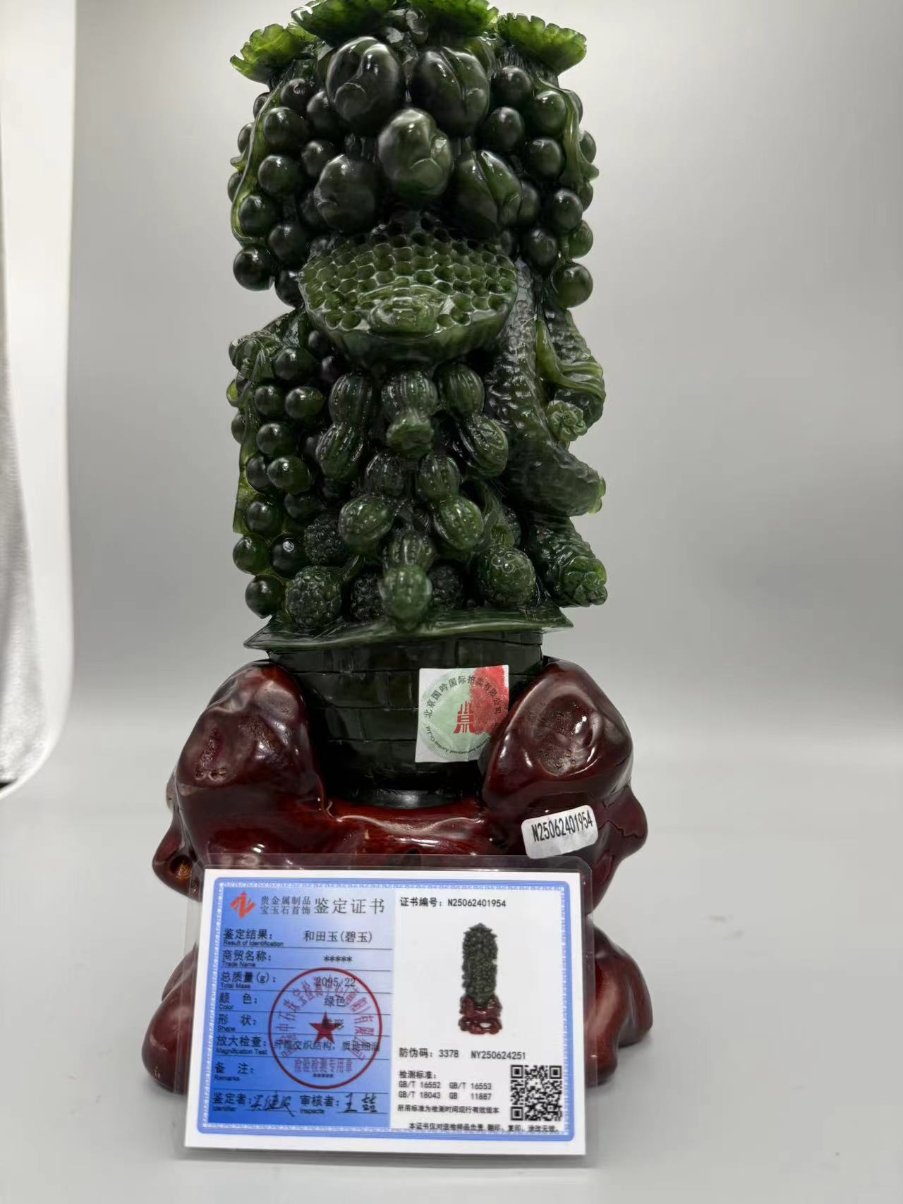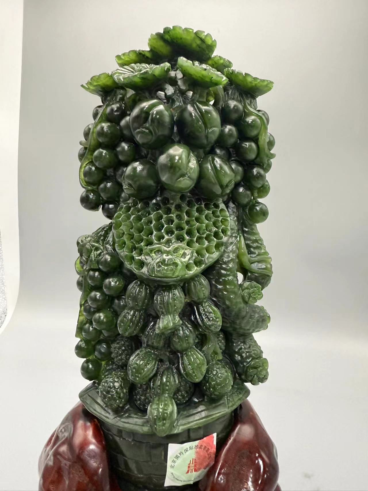 这件玉雕采用和田玉(碧玉)雕刻有葡萄、花生等果实类元素,葡萄颗粒饱满、圆润欲滴,仿佛颗颗晶莹的绿珠簇拥在一起;花生的形态也刻画得栩栩如生,纹理清晰可辨,仿佛能感受到其外壳的粗糙质感。此外,还能看到类似蜂巢等精致细节,工艺十分精湛,将各类元素巧妙融合,营造出一种硕果累累的热闹且富有生机的视觉效果。玉质,那叫一个温润细腻!上手一摸,仿佛能感受到岁月沉淀的柔滑,这可是和田碧玉高品质的体现,每一丝纹理都透着天然玉石的纯粹与精致。再瞧色泽,浓郁的绿色像被好春光浸过,鲜活又饱满,打眼一看,就觉得生机勃勃,特别抓人眼球。形态刻画得栩栩如生,连外壳的纹理都清晰可辨,仿佛能触摸到那带着泥土气息的粗糙质感。
