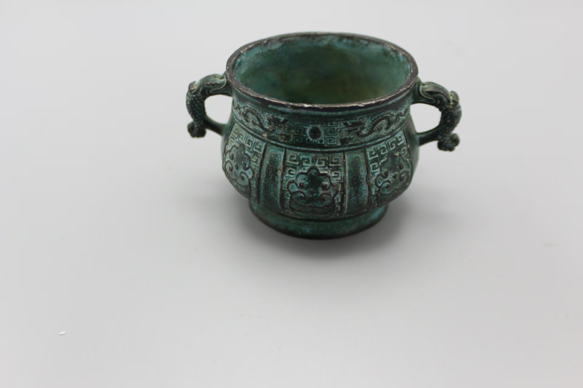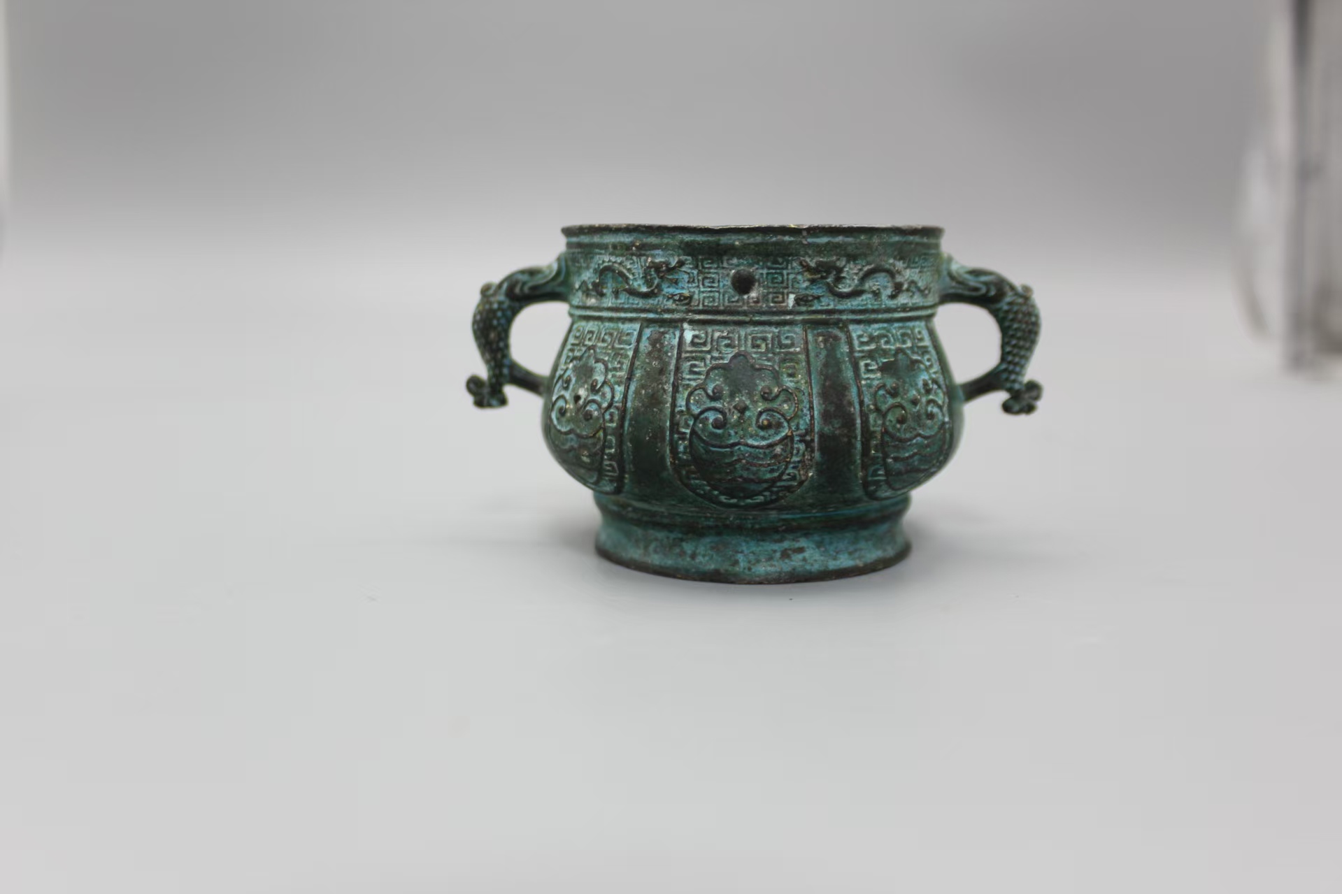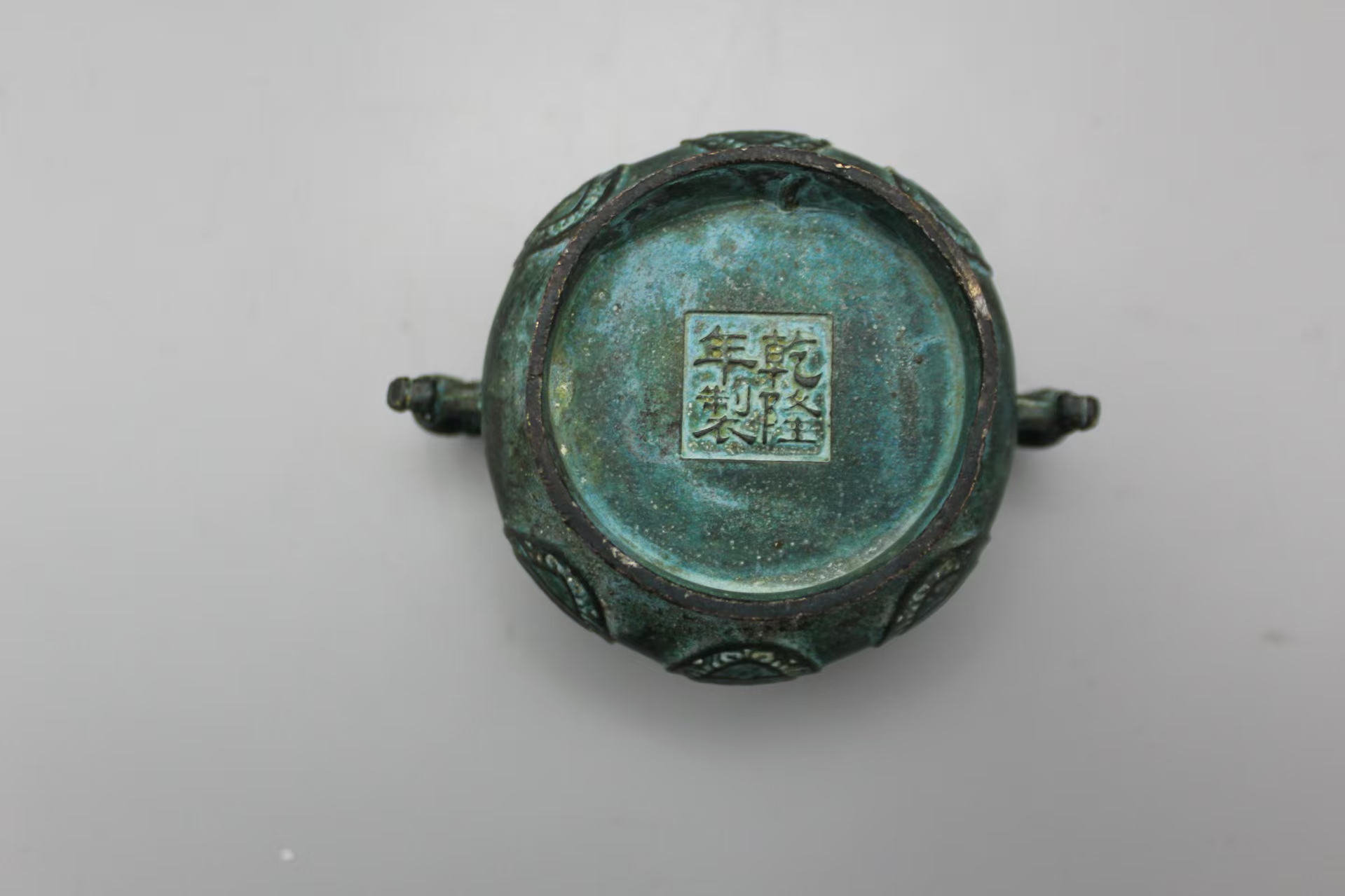 本藏品为清代乾隆时期(18世纪)宫廷器物,乾隆帝对商周青铜器的痴迷推动了此类仿古香炉的制作,属于香具类器物,可用于焚香,营造雅致的茶道、香道氛围, 若作为文玩摆件,可体现藏家对清代宫廷工艺的收藏品味,工艺上融合了传统失蜡法铸造与宫廷纹饰审美, 采用失蜡法一体铸造,采用双耳设计,耳部为龙形造型,雕刻细致,富有古韵,与炉身纹饰形成呼应,体现“纹必吉祥”的宫廷装饰风格, 炉身饰有双龙戏珠、回纹、如意纹等传统纹样,层次丰富,工艺精巧,线条细腻且富有韵律,呈现出浓郁的古风,表面包浆,满布绿锈,底部可见微量银,难得精品方参合贵金属。底部为“乾隆年制”四字篆书款,字体规整如铁丝拼接,笔画起收带锋芒。铜质精纯,手感沉实,断面可见星点状金属光泽,锈色层次丰富,与铜体结合紧密, 纹饰浮雕层次分明,回旋纹线条流畅、比例协调,乃是标准宫廷工艺, 耳饰部位手工打磨痕迹自然。回旋纹象征“富贵连绵”,龙纹体现皇家权威,整体设计既仿古又创新,是乾隆朝“师古而不泥古”工艺思想的体现。