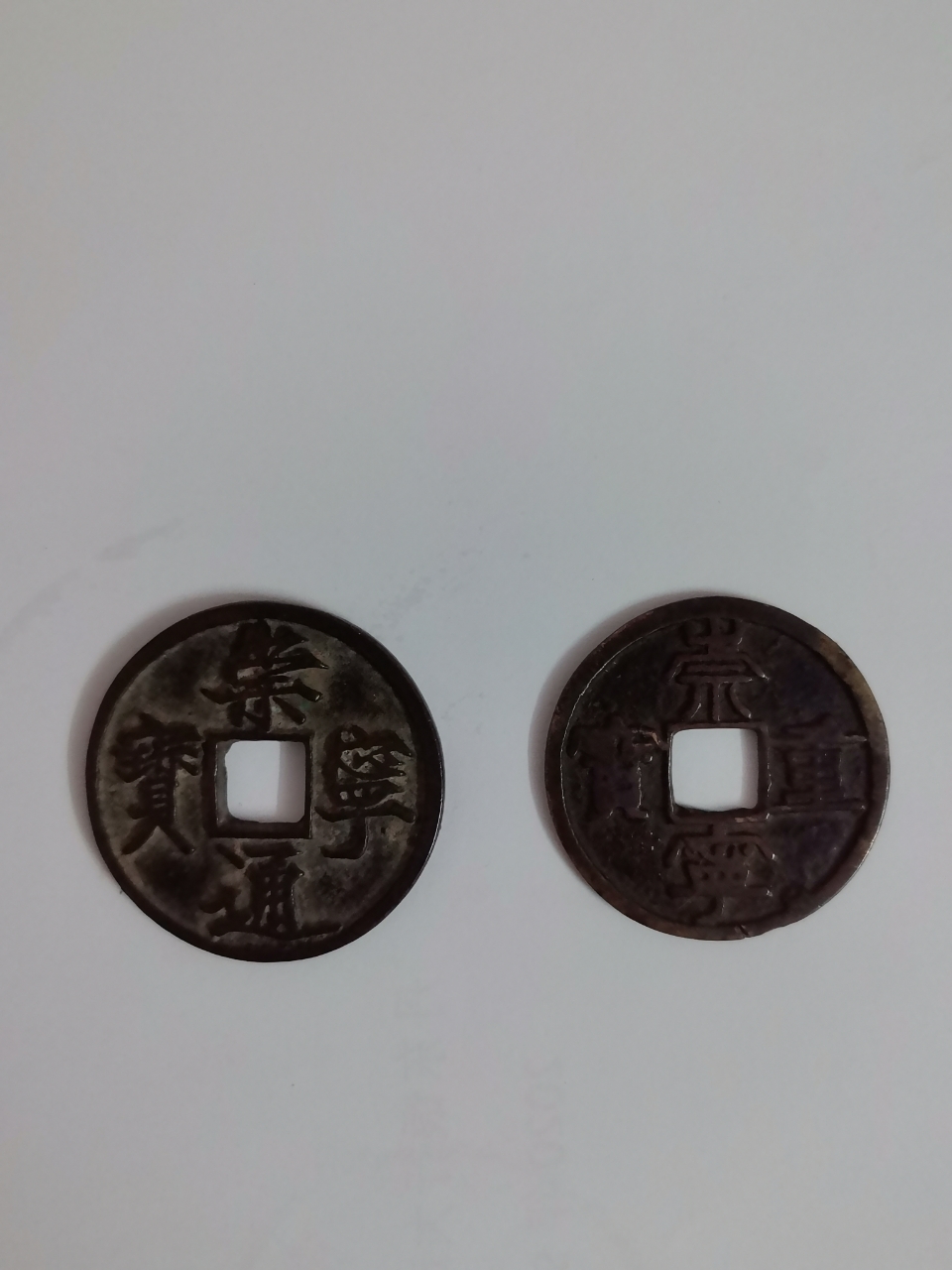 崇宁重宝与崇宁通宝均为北宋徽宗崇宁年间铸币,钱文为徽宗御笔瘦金体,书法精妙。