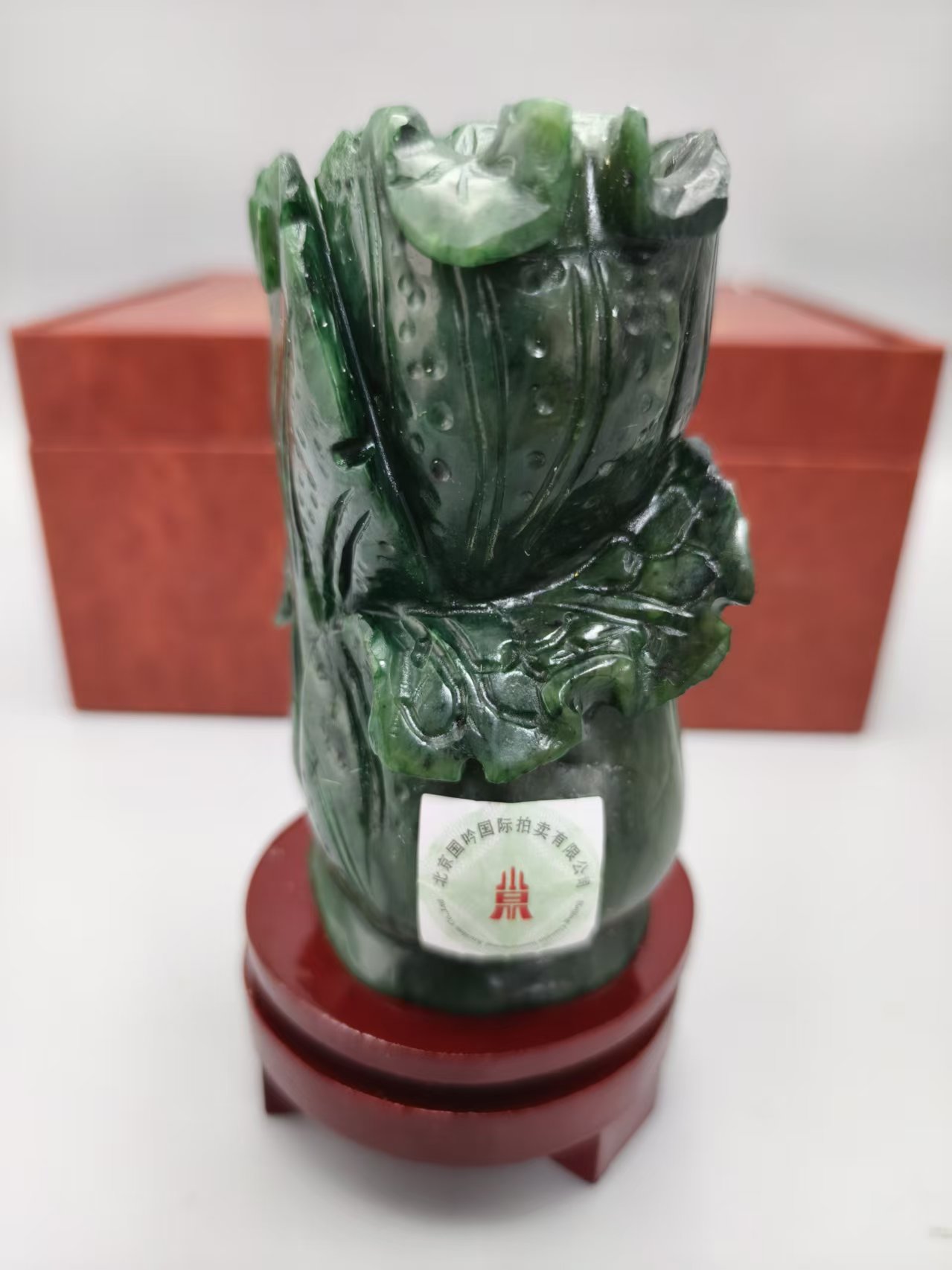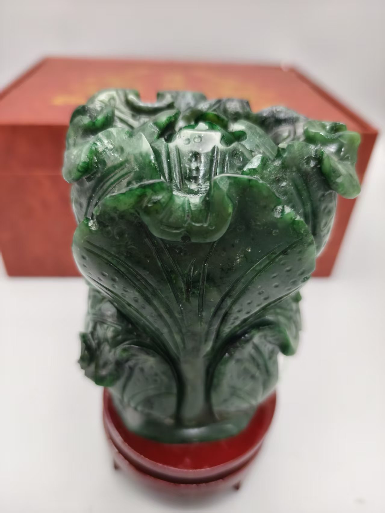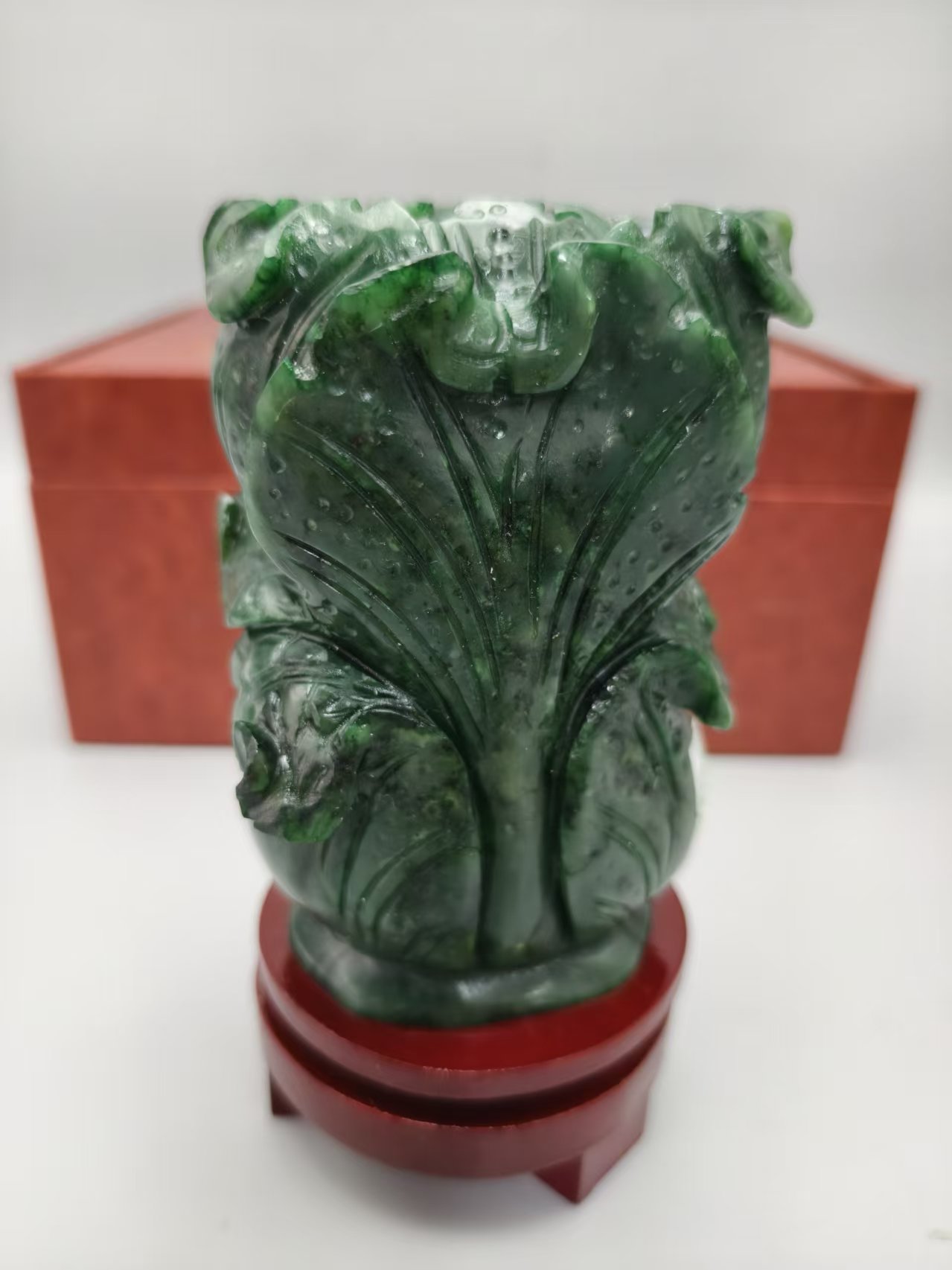 材质上品,属于和田青玉,开采难度极大,已经限制开采。玉料色泽浓郁,玉质细腻;工艺上采用了立体圆雕技法,将白菜的叶脉、菜帮等细节雕琢得较为逼真,菜叶的层次感也比较突出,整体造型饱满生动。
