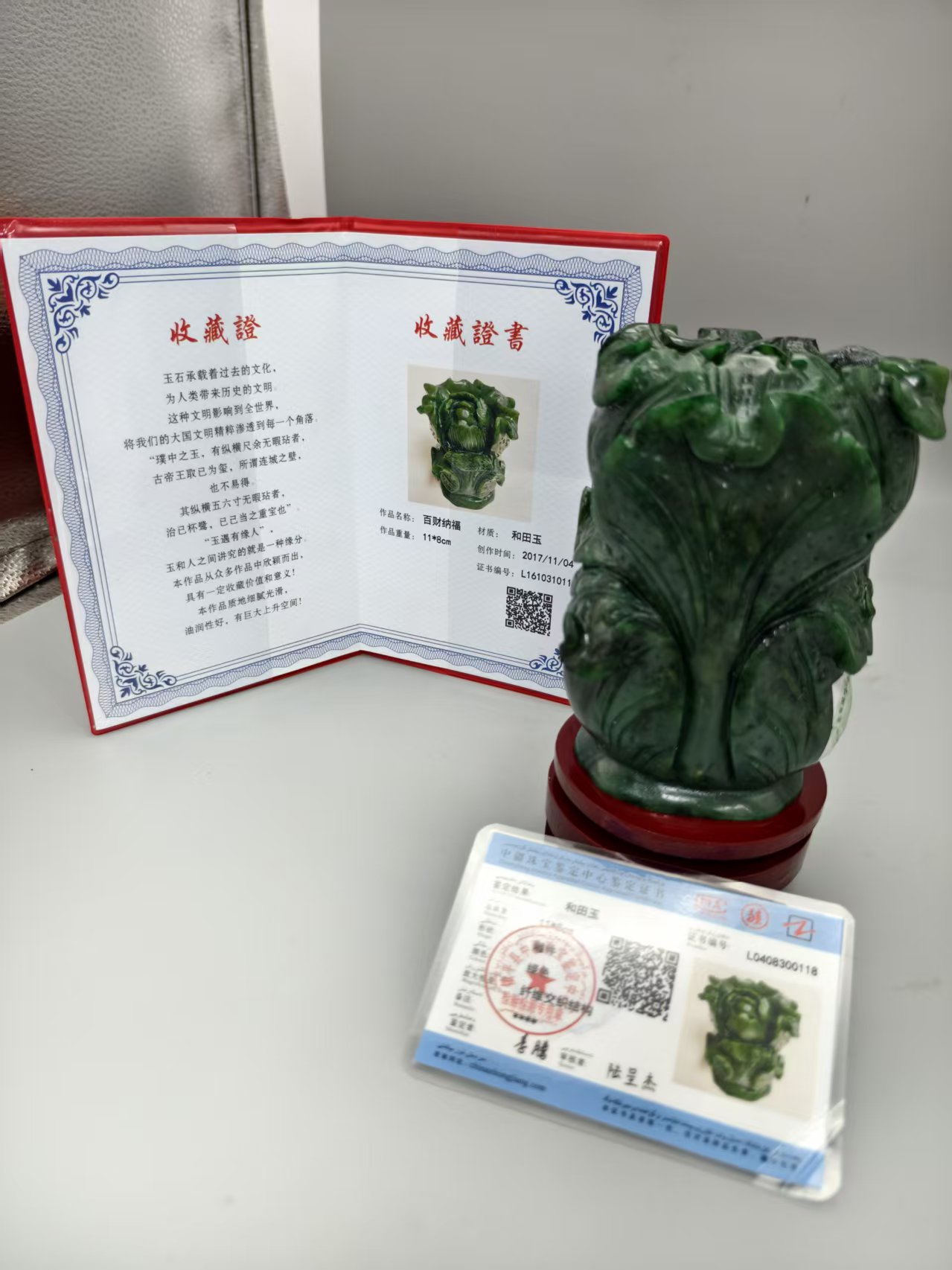 这是一件和田碧玉“百财纳福”白菜摆件,“白菜”谐音“百财”,寓意招财纳福、富贵吉祥。