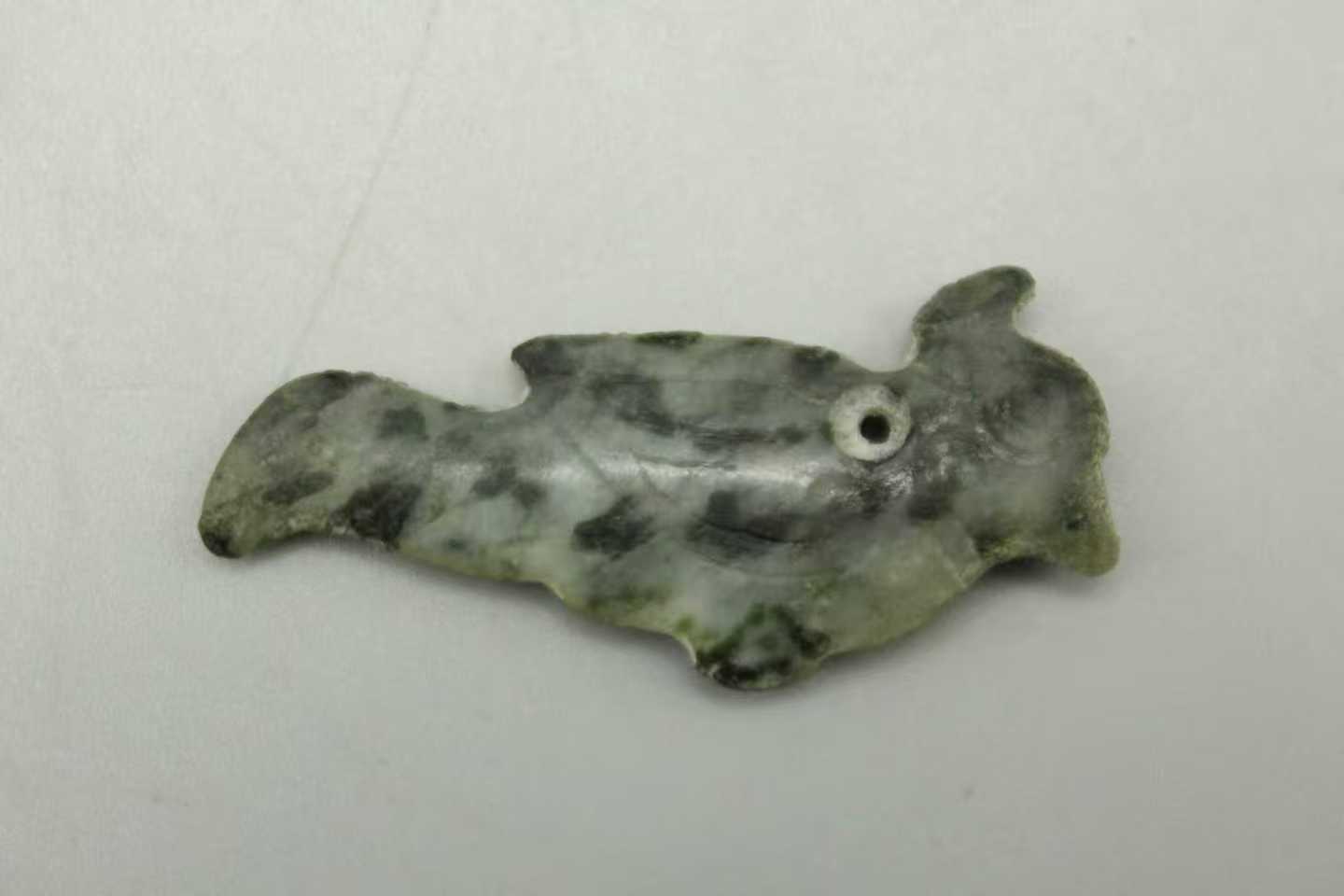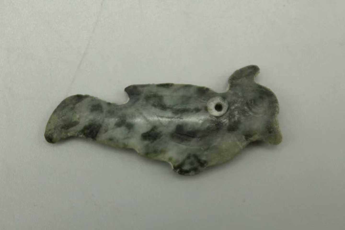 它以灰白为底,晕染着墨色的斑痕,那是千年岁月浸出的包浆——像西周的晨雾,轻轻覆在这只“飞鸟”的羽上。造型简而有神:流线的身形似正振翅,头部的穿孔藏着古人的温度——曾被丝绳系起,坠在衣襟间,随步履轻摇,和着礼乐声轻响。