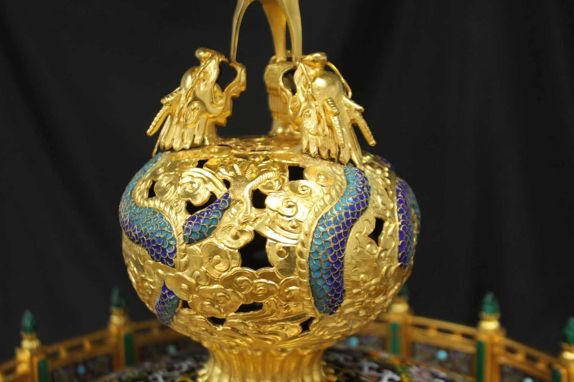 其价值核心首先源于顶级工艺的极致呈现。座龙花薰采用“铜胎掐丝珐琅”这一非遗技艺,经制胎、掐丝、点蓝、烧蓝、磨光、镀金等百道工序手工打造。龙身鳞片以细如发丝的铜丝精密勾勒,每片鳞片的填色均需多次点蓝、反复烧制,色彩醇厚均匀,光泽温润如玉;龙首龙须栩栩如生,龙爪刚劲有力,细节处尽显匠心,将景泰蓝“精、细、巧”的工艺特质发挥到极致。