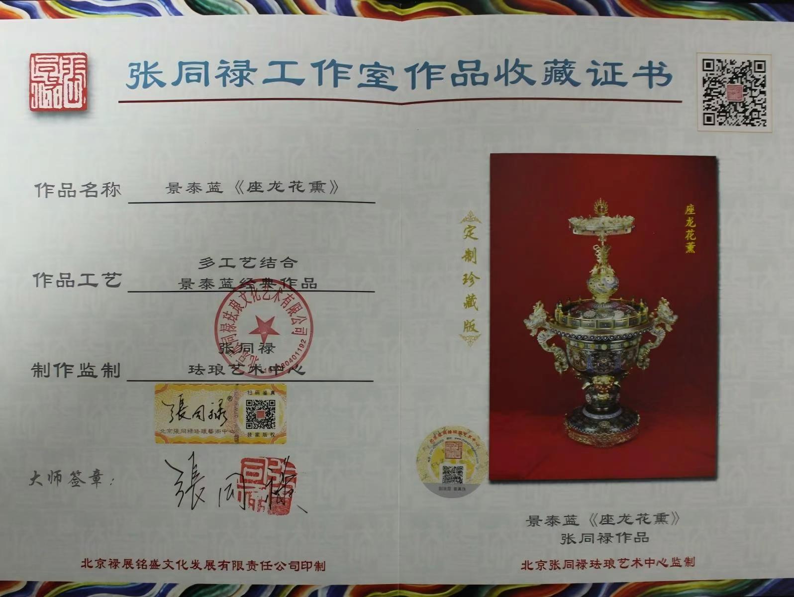 其次,大师背书赋予稀缺价值。张同禄作为“中国景泰蓝第一人”,深耕行业六十余年,独创“垂绕式”掐丝技法,其作品兼具传统韵味与现代审美,屡获国际国内大奖。座龙花薰作为其代表性题材作品,限量创作且工艺难度极高,每一件均为大师亲授指导、核心团队制作,附有权威鉴定证书,稀缺性直接推高收藏价值。