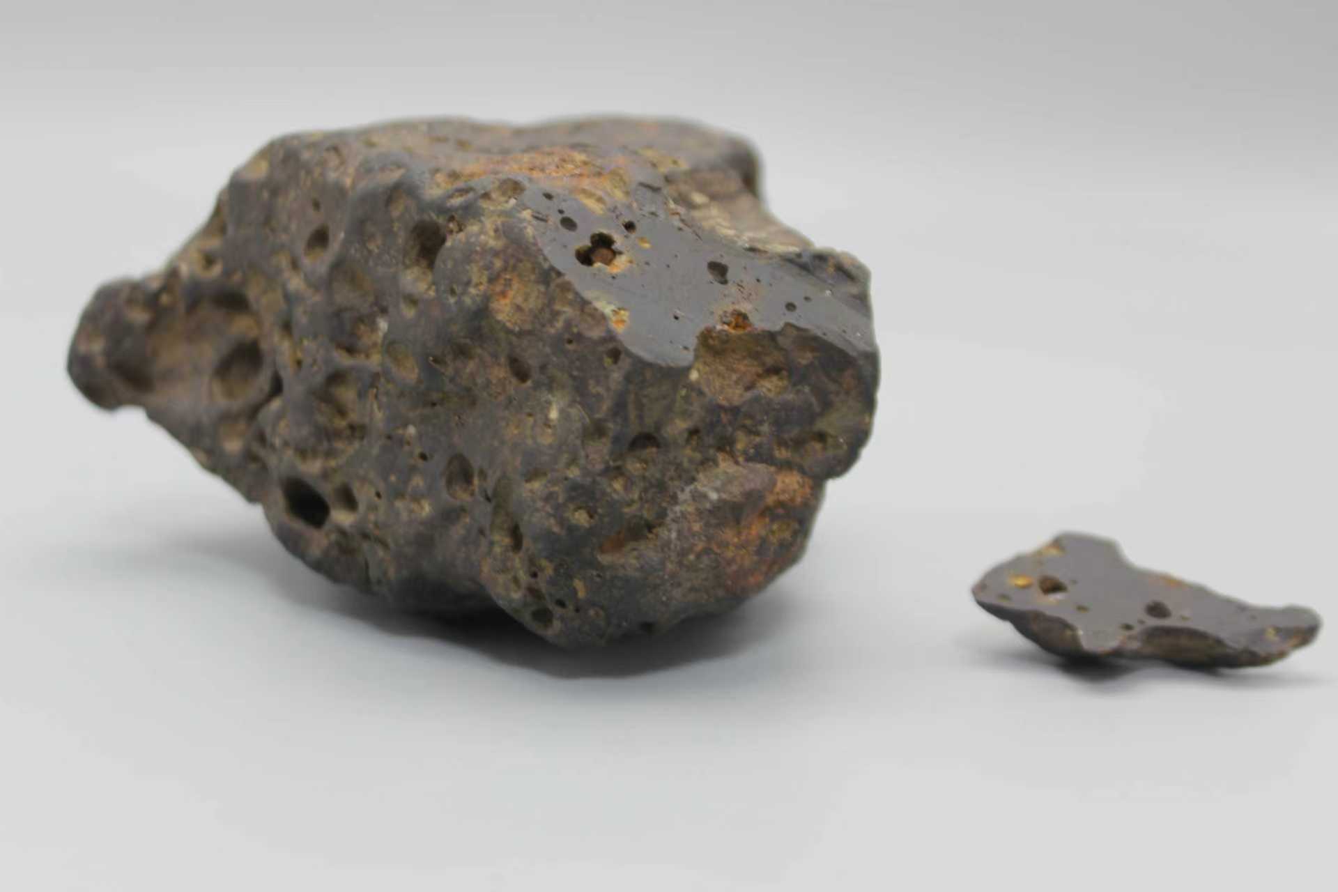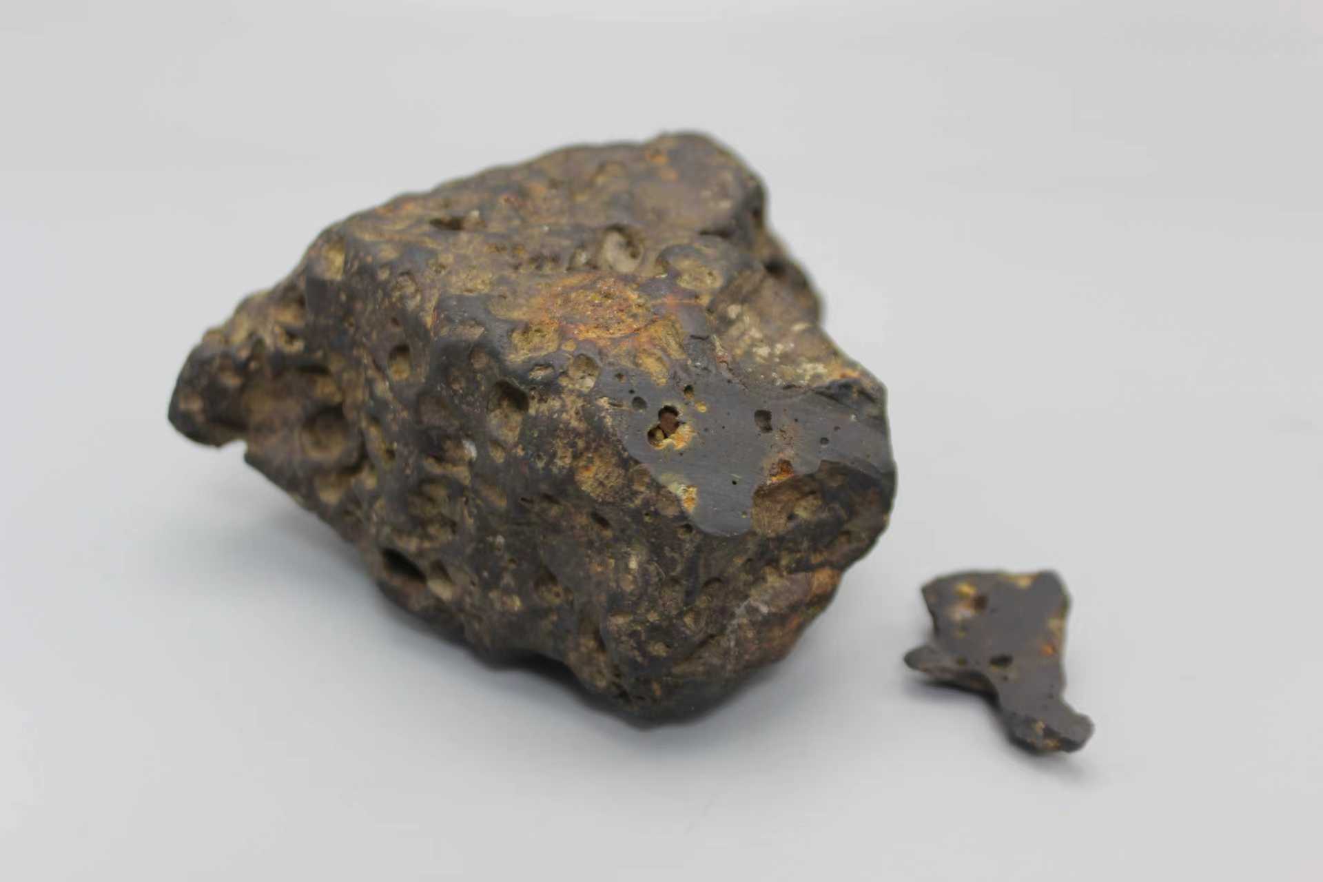 本品为罕见石铁陨石(又称“陨铁石”)石铁陨石较为稀少是较为罕见的一类陨石,在陨石数量中仅占 2% - 4% 它主要由硅酸盐矿物与铁镍合金组成,硬度6.6多,表面留存着穿越大气层时灼烧形成的气印、熔壳等特征明显,呈现出独特的沧桑质感,尤为珍贵,科研价值极高,它的研究对于探索天体的起源和演化,研究行星内部的物质组成,具有十分重要的意义。从拍卖价值来看,石铁陨石因同时含金属镍铁与硅酸盐矿物,是陨石收藏中的“黄金品类”:2023年佳士得一件720g同类石铁陨石拍至28.6万美元,2024年苏富比一件910g石铁陨石以34.2万美元落槌,近三年同重量区间拍品年均涨幅超18%。此件陨石保留完整的熔壳与气印特征,表面黑色玻璃质熔壳包裹着棕褐色氧化层,气印呈指状凹陷分布,符合高空陨落时的高温熔融痕迹;部分区域可见金属颗粒与灰黑色的石质部分相互交织,兼具科研价值与收藏价值,属稀缺陨石品类。