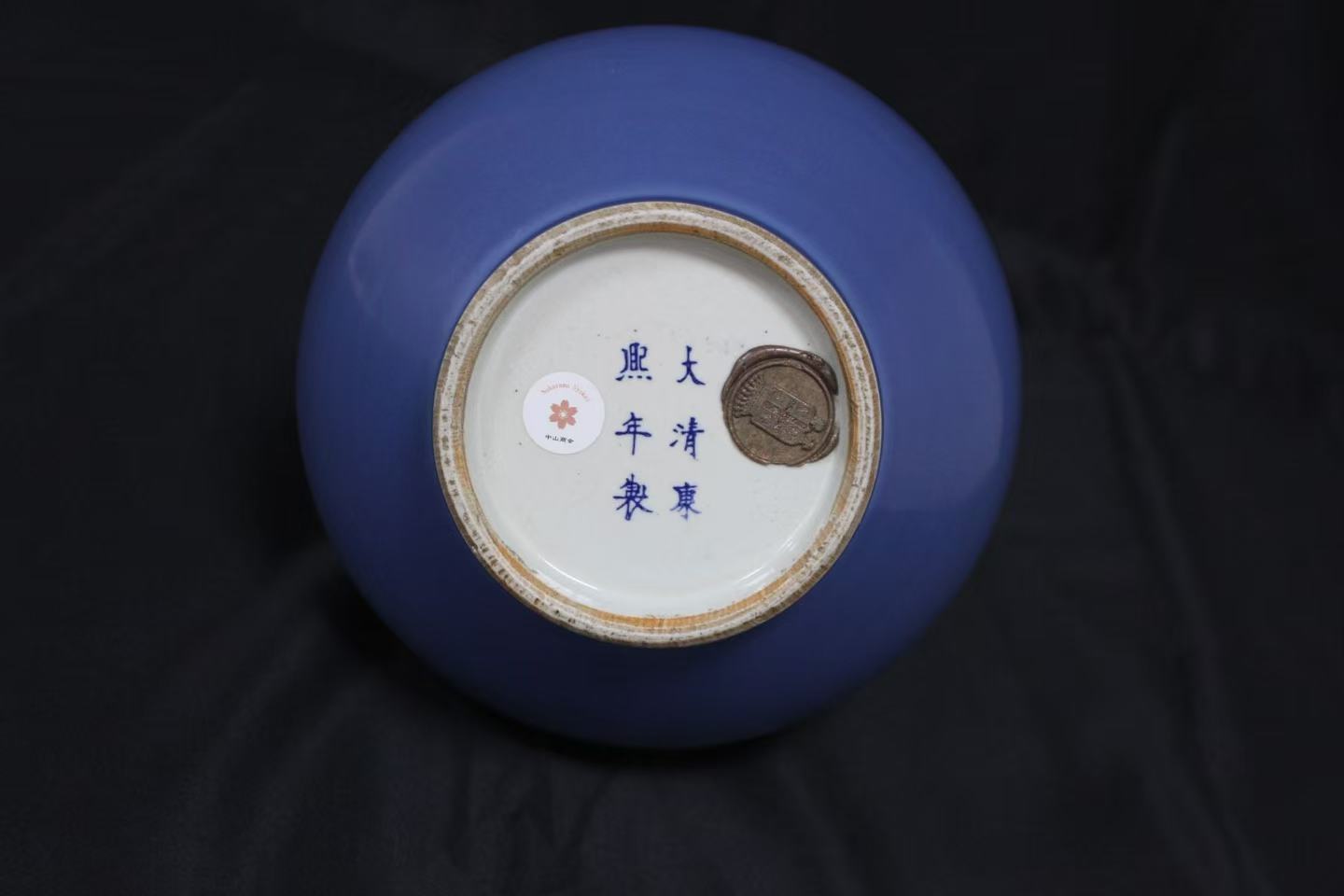从拍卖价值来看,康熙霁蓝釉立件历来是单色釉拍场的“硬通货”:2022年北京保利一件同类长颈瓶拍至268万元,2024年香港苏富比一件康熙霁蓝釉胆瓶以312万元落槌,近三年同品类拍品年均涨幅超18%。此瓶施釉肥厚均匀,霁蓝釉色如“宝石浓蓝”,釉面光泽莹润无流釉,符合康熙朝“蓝釉如靛、匀净无瑕”的工艺标准;器型为“锥把瓶”变体,长颈挺拔、腹身饱满,底足青花书“大清康熙年制”六字楷书款,字体刚劲规整,是康熙官窑款识的典型特征,预估当前市场流通价在320万-360万元区间,未来5年有望突破450万元。康熙朝霁蓝釉立件多为宫廷陈设用瓷,其烧制采用“吹釉法”,釉层厚度均匀且无积釉,将清代“单色釉重质感”的审美推向极致,是研究康熙官窑单色釉烧造工艺的核心实物。此外,瓶身无冲线、仅口沿有微小缩釉点,保存状态在康熙霁蓝釉立件中属上佳,进一步夯实了其“博物馆级藏品”的属性。