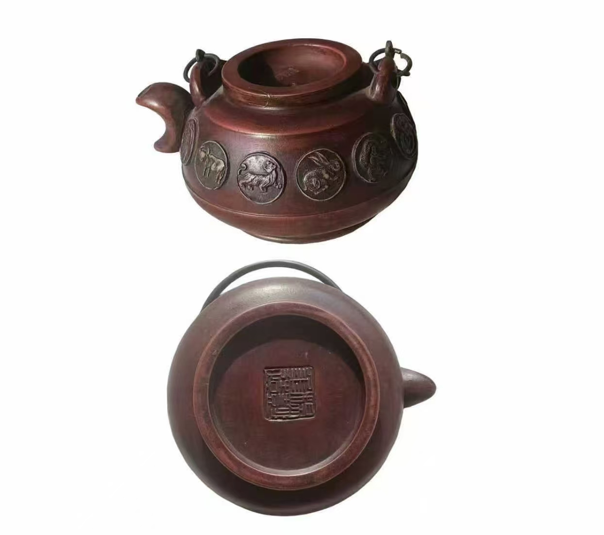 壶身裹着温润的紫红釉色,摸起来该是细腻得像抚过古玉~壶身上那十二生肖的浮雕更是点睛之笔,一个个小动物神态鲜活,像是把一整个祥瑞福泽都刻在了壶上,喝茶的时候盯着看都觉得讨喜!