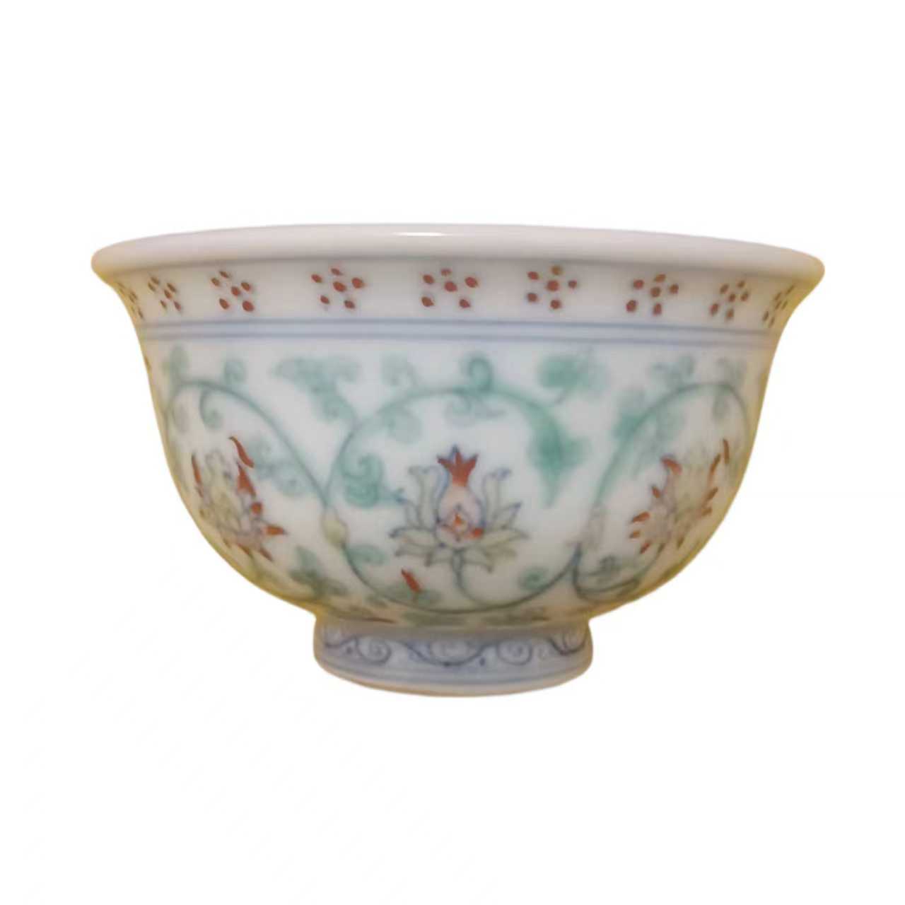 该件明代斗彩碗是明代瓷器中的珍品,以釉下青花与釉上彩绘相结合的斗彩工艺制成,创烧于宣德年间,至成化时期达到艺术高峰。