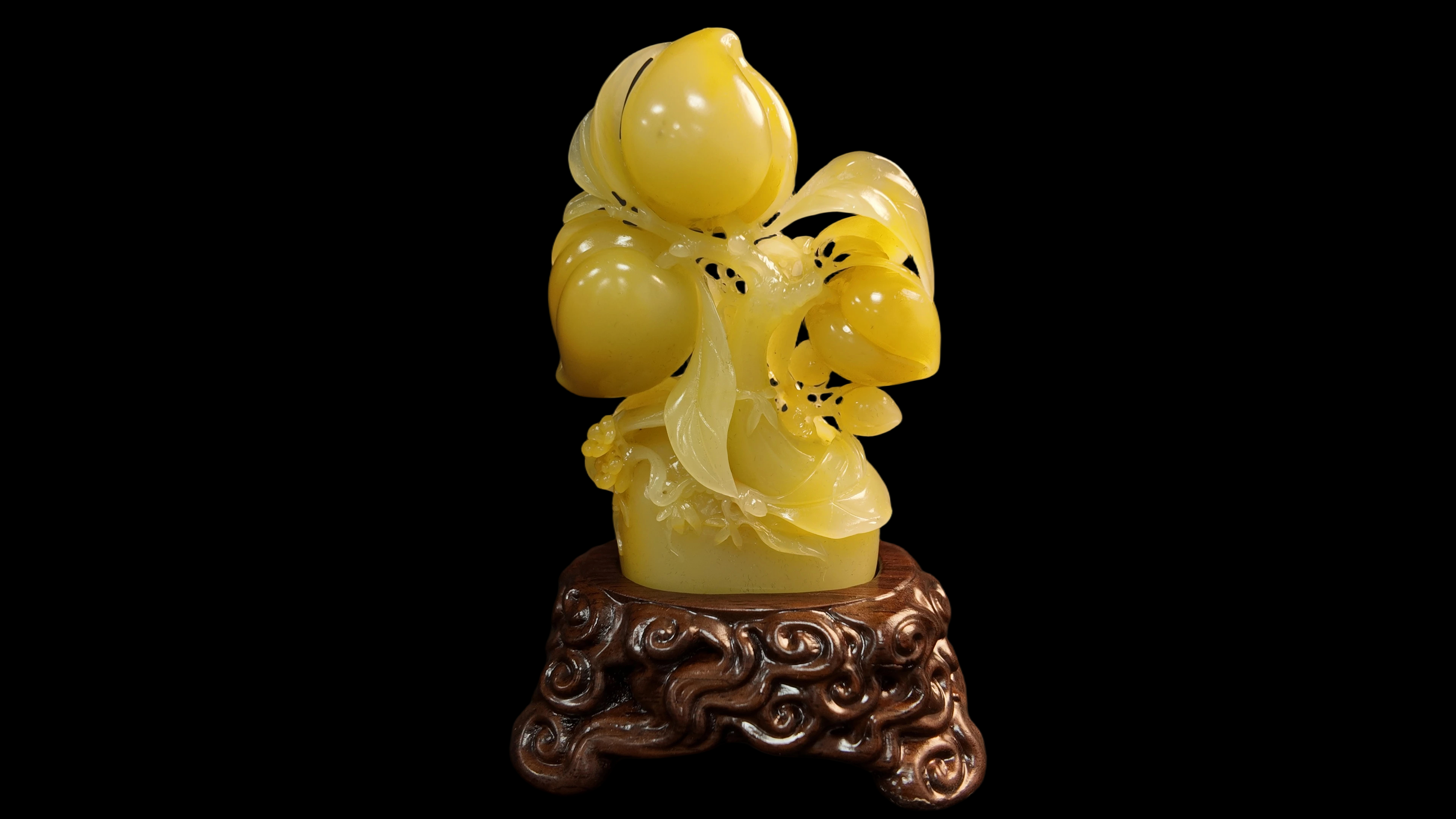 此件《福寿千年》印章,为寿山石雕刻名家留大伟先生精工之作,采用上品芙蓉 石雕琢而成。石材呈鸡油黄,质地凝腻莹润,色泽匀净通透,属寿山芙蓉石珍品,是芙蓉石印章中难得的佳料。本作依石材天然的色泽与质地顺势而雕琢,主体取寿桃题材,三颗寿桃饱满圆润,果肉巧用石材的蜜蜡黄,质感莹润如凝脂,桃身的弧度与肌理刻画写实,仿若鲜活果实垂挂枝头;枝叶以透雕、浮雕技法雕琢,脉络纤细灵动,与寿桃的厚重形成虚实对比,枝蔓卷曲舒展间尽显自然生趣,整作无拼接、无瑕疵,雕工精湛入微:寿桃的光泽感、桃叶的薄透感皆通过刀法精准呈现,将芙蓉石的温润质感与寿桃的吉祥寓意完美融合,搭配的红木祥云纹底座,雕工繁复精美,与石雕主体的“福寿”主题相呼应,更添古朴雅致的陈设韵味,印章形制规整,雕工与材质相得益彰,寿桃寄寓福寿千年的美好祈愿,兼具收藏价值与吉祥寓意