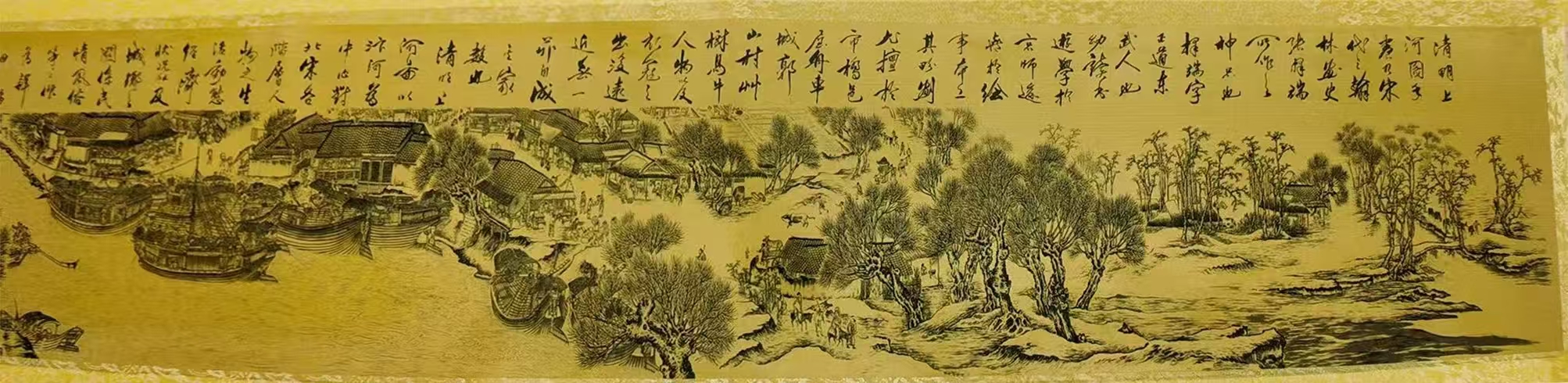 画卷内容可分三段:首段绘城郊春光,疏林薄雾间,农人耕作、商旅往来,毛驴驮货赶路,一派宁静的乡野气息;中段为画卷核心,展现汴河漕运盛景,河面船只穿梭,最引人注目的是一座巨型木结构拱桥,桥上行人如织,摊贩叫卖声仿佛可闻,桥下大船正放倒桅杆准备过桥,船夫们各司其职,场面紧张又富有生活情趣;后段则是繁华的市井街道,商铺林立,酒楼、当铺、茶坊一应俱全,车马行人摩肩接踵,士农工商、男女老少等各色人物神态各异,尽显北宋都城的富庶与热闹。